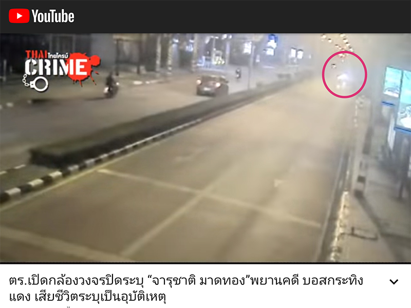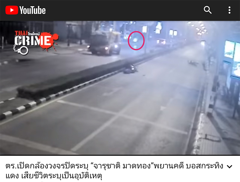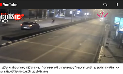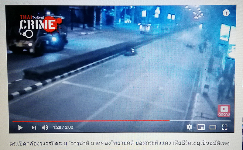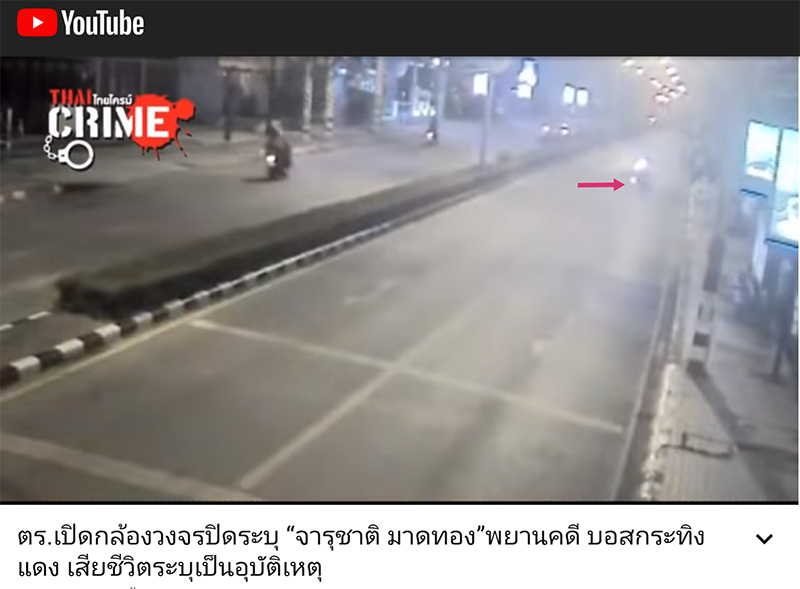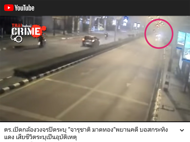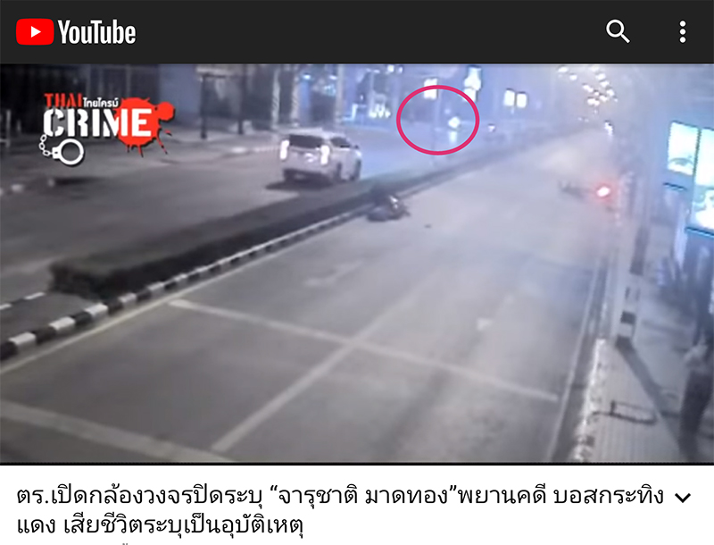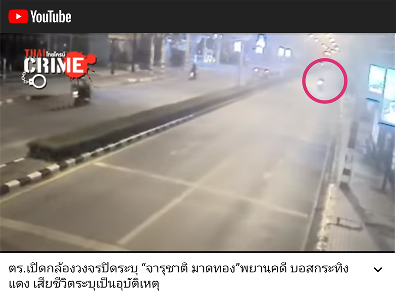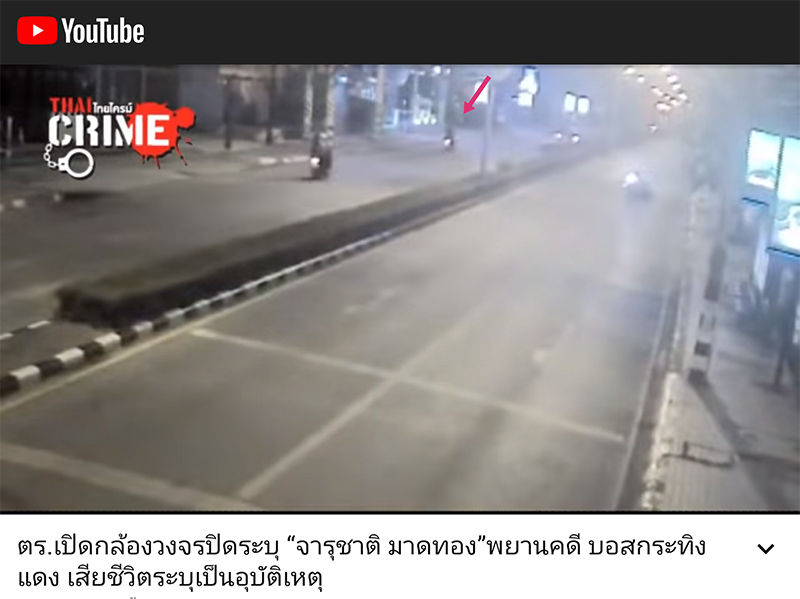 00:53 รถจักรยานยนต์ไฟท้ายสีแดง ขับแล่นเข้ามาดูเหตุการณ์ ดิ่งไปใกล้จุดที่จารุชาตินอนอยู่1:06 ชายคนดังกล่าวไปยืนใกล้จารุชาติ