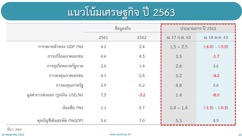 ขณะที่สำนักงานสภาเศรษฐกิจและสังคมแห่งชาติ (สศช.) ประมาณการณ์เศรษฐกิจทั้งปี 2563 คาดว่าเศรษฐกิจไทยจะติดลบ 5-6% จากเดิมที่ประการการณ์ไว้ว่าเศรษฐกิจไทยจะเติบโต 1.5-2.5%