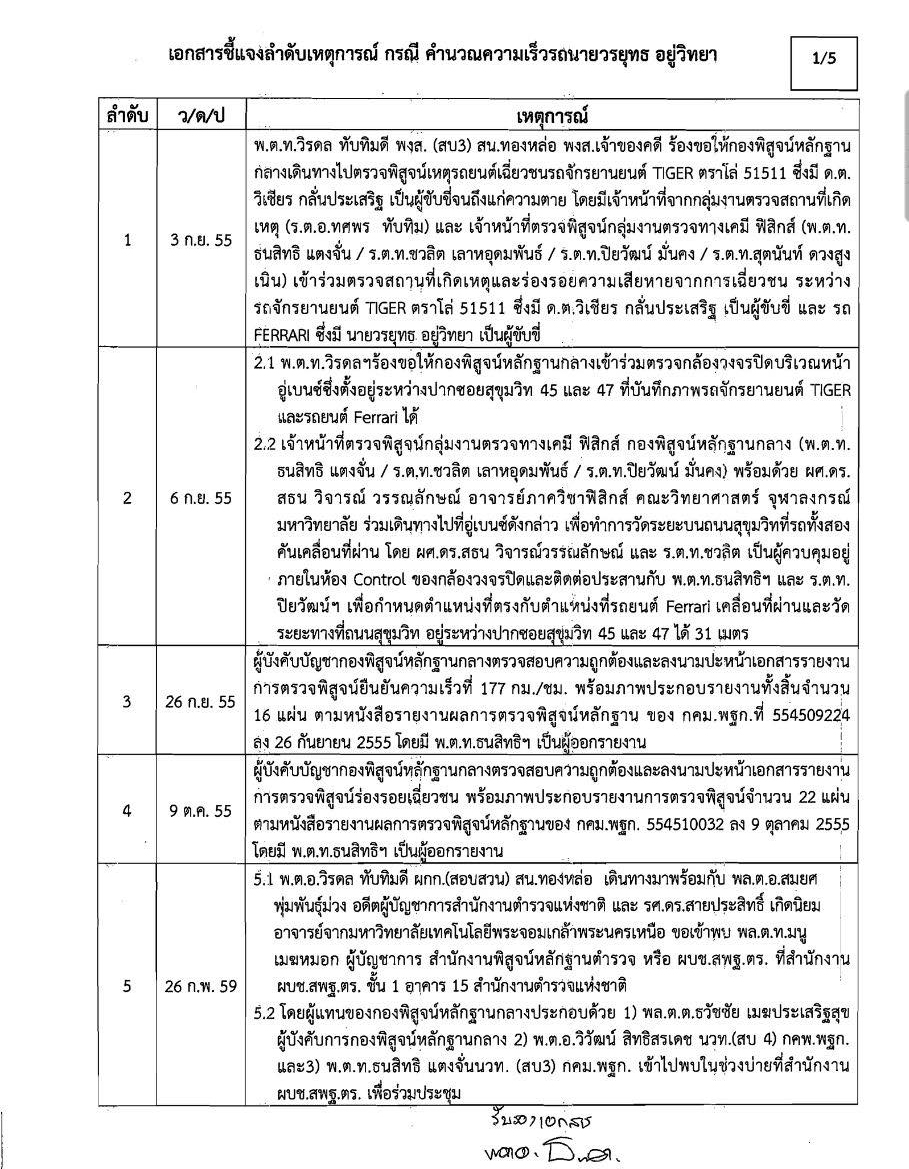 5. พร้อมกันนั้น พ.ต.อ.วิรดลฯ ให้ พ.ต.ท.ธนสิทธิฯ ให้ปากคำเรื่องการคำนวณตามสมมุติฐานของอาจารย์สายประสิทธิ์ โดยถามถึงความคลาดเคลื่อนที่สามารถเกิดขึ้นได้จากการคำนวณตามรายงานการตรวจพิสูจน์ เมื่อ 26 กันยายน 2555 ที่ได้ 177 กม./ชม. ซึ่งพ.ต.ท.ธนสิทธิฯ ได้ให้ปากคำว่าอาจเกิดขึ้นได้ตามหลักทางวิทยาศาสตร์ ส่วนในเรื่องความคลาดเคลื่อนตามสมมุติฐานของอาจารย์สายประสิทธิ์ ในเวลานั้นซึ่งซึ่งพึ่งได้เห็นสมมุติฐานของอาจารย์สายประสิทธิ์เป็นครั้งแรกจึงไม่สามารถบอกได้ว่ามีความคลาดเคลื่อนหรือความบกพร่องอย่างไร