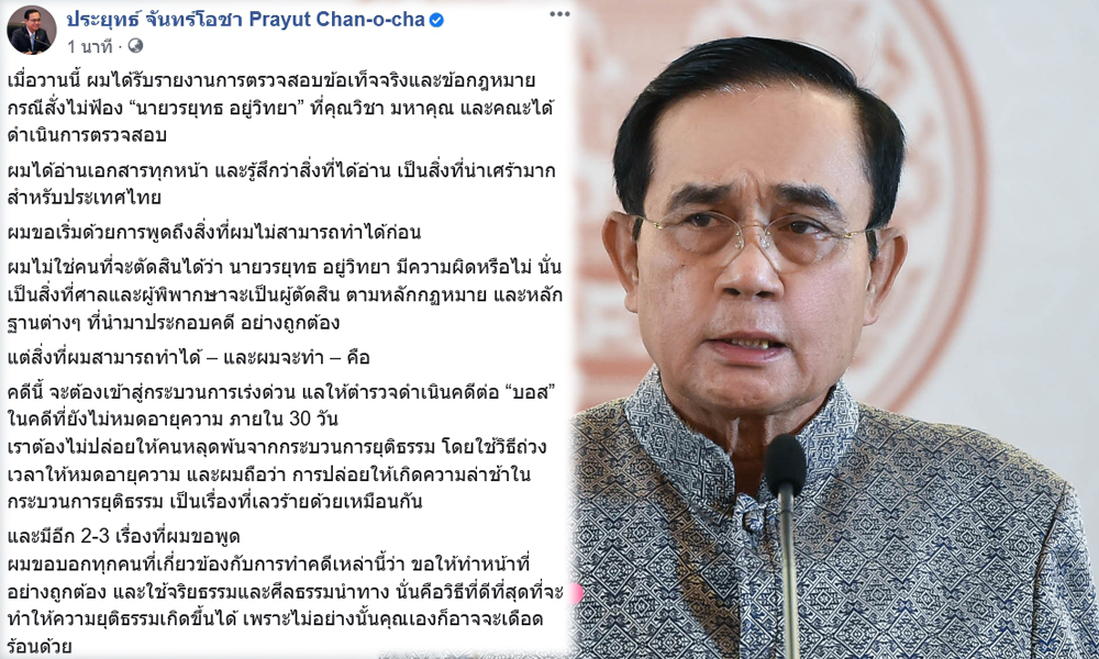 สำนักข่าวอิศรา (www.isranews.org) รายงานว่า เมื่อวันที่ 1 ก.ย. พล.อ.ประยุทธ์ จันทร์โอชา นายกรัฐมนตรี และ รมว.กลาโหม โพสต์ข้อความผ่านเฟซบุ๊ก ประยุทธ์ จันทร์โอชา Prayut Chan-o-cha ระบุว่า เมื่อวานนี้ ตนได้รับรายงานการตรวจสอบข้อเท็จจริงและข้อกฎหมาย กรณีสั่งไม่ฟ้องนายวรยุทธ อยู่วิทยา หรือ บอส ที่ขับรถชนตำรวจเสียชีวิตเมื่อปี 2555 ที่มีนายวิชา มหาคุณ และคณะได้ดำเนินการตรวจสอบ โดยได้อ่านเอกสารทุกหน้า และรู้สึกว่าสิ่งที่ได้อ่าน เป็นสิ่งที่น่าเศร้ามากสำหรับประเทศไทย โดยสิ่งที่ไม่สามารถทำได้ คือ ตนไมใช่คนตัดสินว่า นายวรยุทธ จะมีความผิดหรือไม่ เป็นสิ่งที่ศาลและผู้พิพากษาจะเป็นผู้ตัดสิน ตามหลักกฎหมาย และหลักฐานต่างๆ ที่นำมาประกอบคดี อย่างถูกต้อง