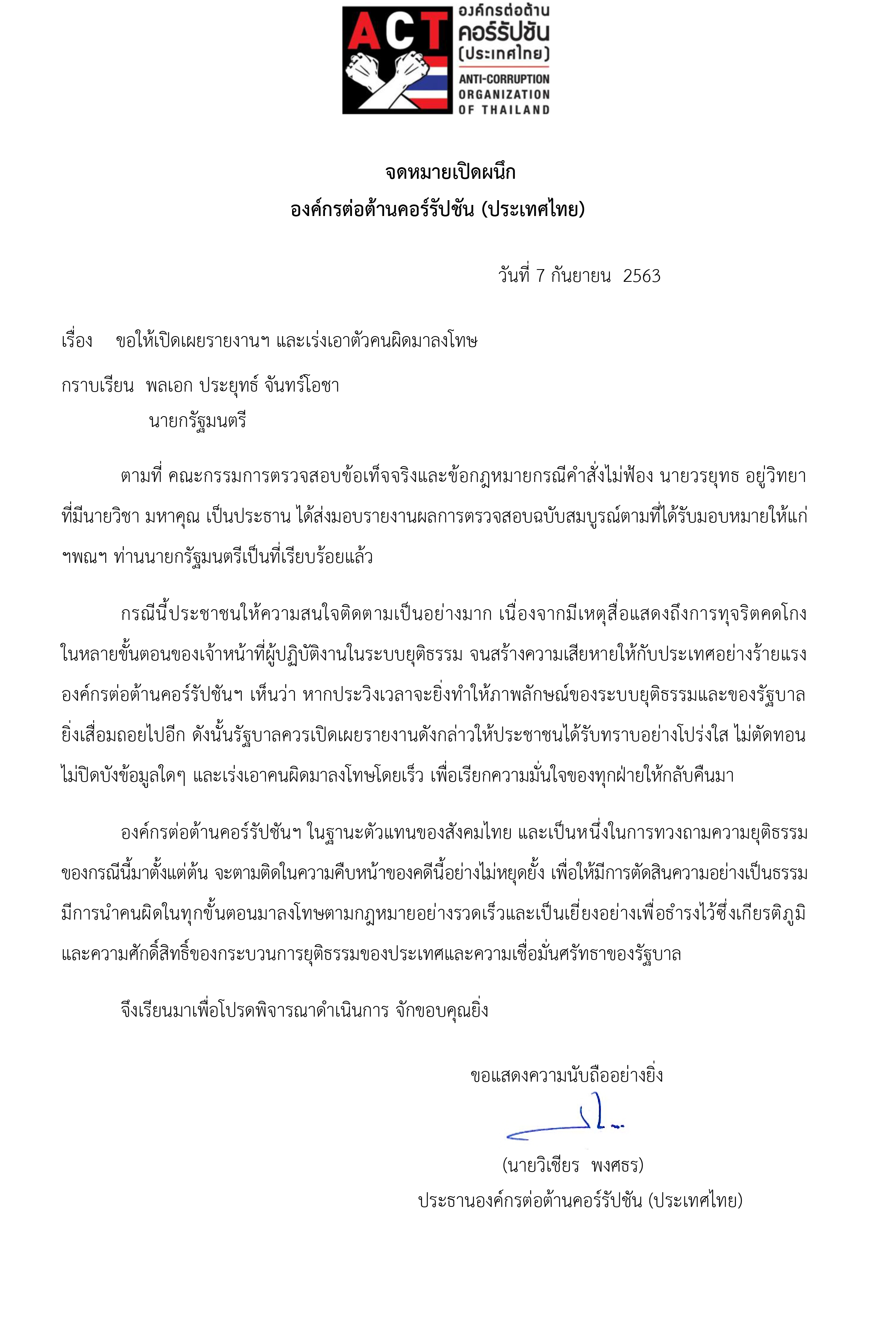 สำนักข่าวอิศรา (www.isranews.org) รายงานว่า เมื่อวันที่ 7 กันยายน 2563 องค์กรต่อต้านคอร์รัปชัน (ประเทศไทย) หรือ ACT ได้ออกจดหมายเปิดผนึกถึง พลเอก ประยุทธ์ จันทร์โอชา นายกรัฐมนตรี ลงนามโดย นายวิเชียร พงศธรประธานองค์กรต่อต้านคอร์รัปชัน (ประเทศไทย) เรื่อง ขอให้เปิดเผยรายงานผลการสอบสวนคดีบอส อยู่วิทยา และเร่งเอาตัวคนผิดมาลงโทษ โดย เนื้อหาในจดหมายเปิดผนึก ระบุ ดังนี้