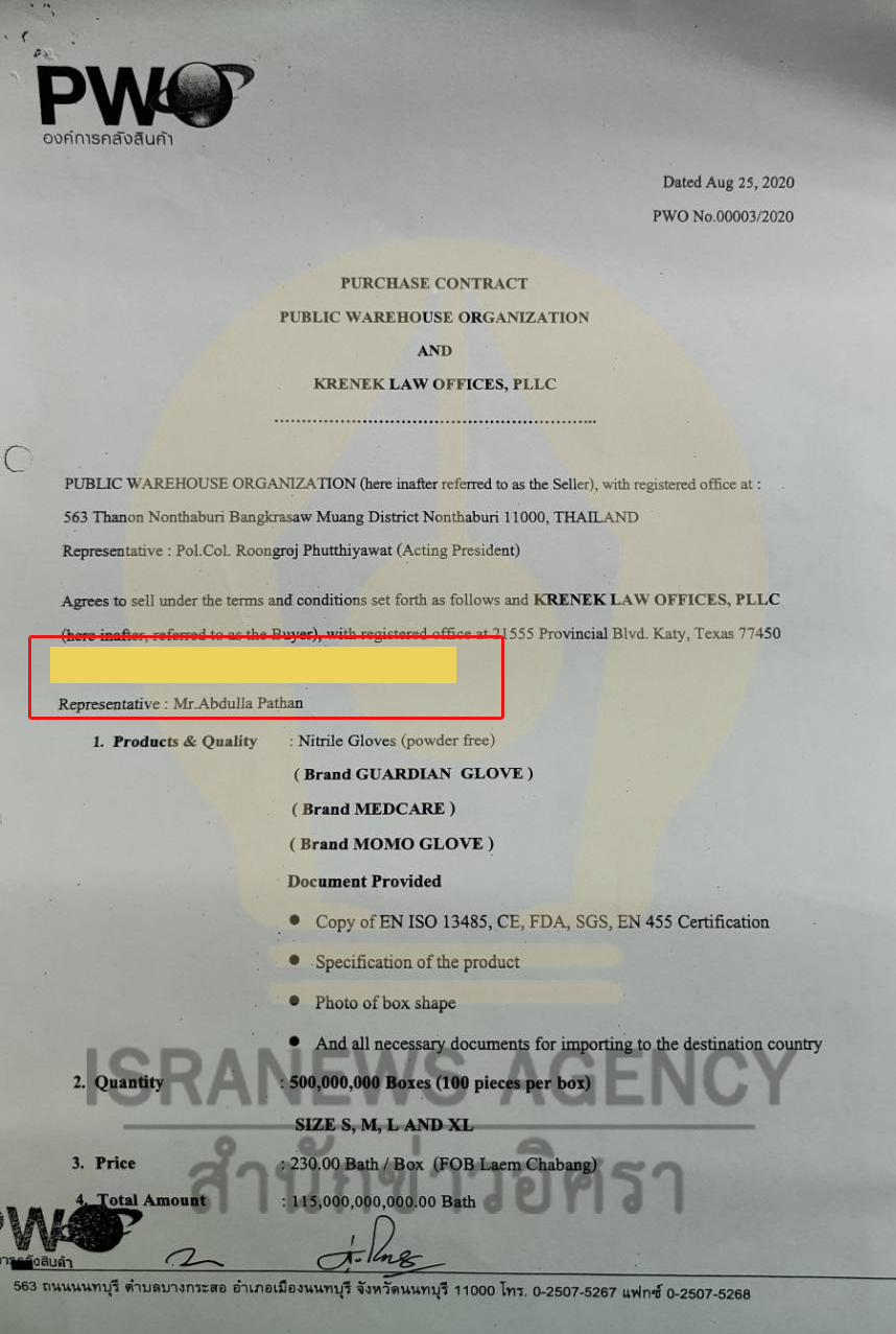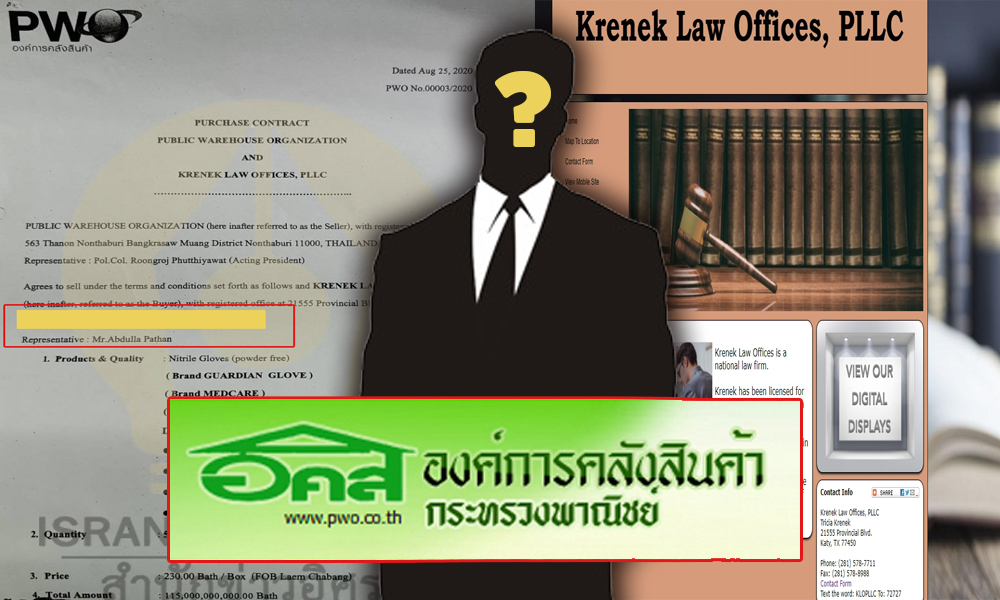 "... ตัวแทนของ Krenek Law Offices,PLLC ที่มาลงนามกับ อคส.คือ นาย Abdullah Pathan ระบุส่งออกสินค้า จำนวน 3 ยี่ห้อ คือ การ์เดี้ยนโกลฟ เมดแคร์ และ โมโม โกลฟ ..อย่างไรก็ตาม สำนักข่าวอิศราตรวจสอบยังไม่พบข้อมูล นาย Abdullah ปรากฎอยู่บนเว็บไซต์Krenek Law Offices,PLLC แต่อย่างใด ..."
