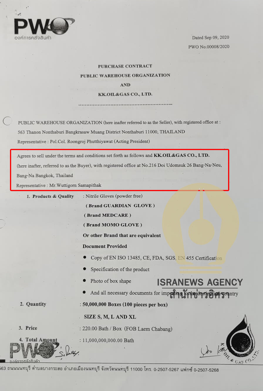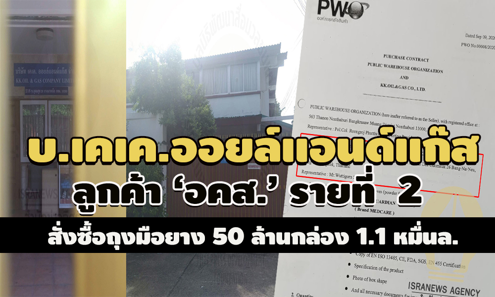 โดยในบันทึกข้อตกลงที่ทำกับ อคส. เมื่อวันที่ 9 ก.ย.2563 ระบุว่า บริษัท เคเค.ออยล์แอนด์แก๊ส จำกัด สั่งซื้อสินค้าจำนวน 50,000,000 กล่อง ราคากล่องละ 220 บาท รวมมูลค่า 11,000,000,000 บาท แจ้งที่อยู่เลขที่ 216 ซอยอุดมสุข 26 แขวงบางนาเหนือ เขตบางนา กรุงเทพมหานคร