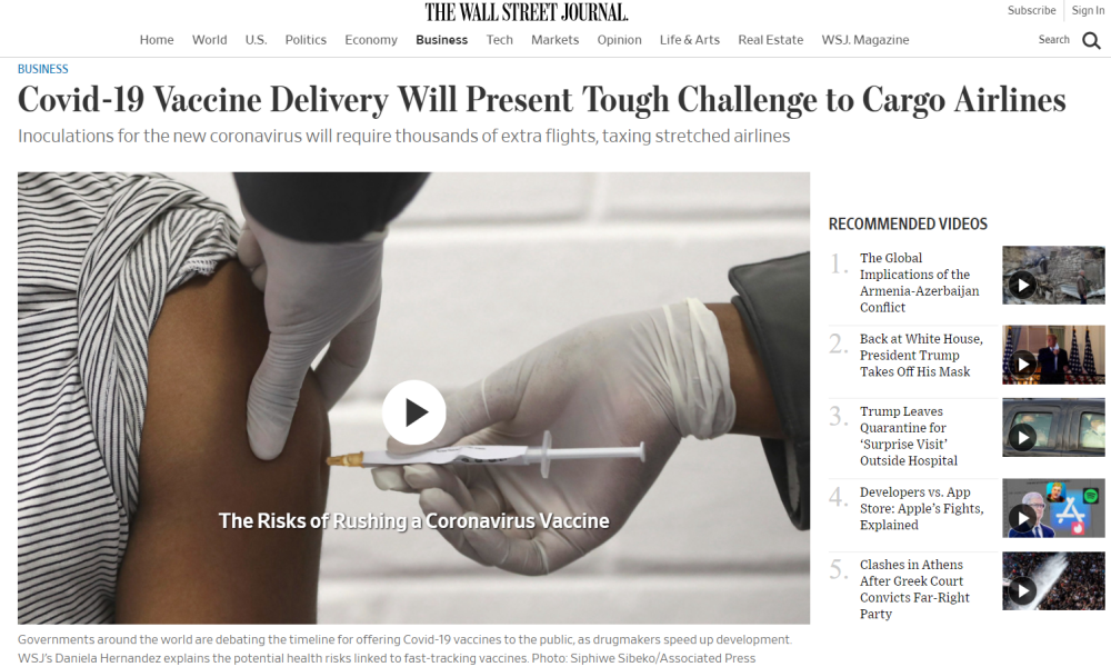 "...ณ เวลานี้ อุตสาหกรรมการขนส่งทางอากาศกำลังวางแผนว่าจะจัดส่งวัคซีนสำหรับไวรัสโควิด-19 จำนวน 2 พันล้านโดสได้อย่างไร แม้ว่าฝ่ายที่เกี่ยวข้องจะยังไม่ได้อนุวัติวิธีการใช้วัคซีนที่กำลังพัฒนาเพื่อกรรักษาก็ตาม โดยบริษัทขนส่งได้กล่าวว่าตอนนี้พวกเขากำลังต้องวางแผน โดยไม่อาจรับรู้ได้เลยว่าจะมีวัคซีนจำนวนกี่โดสที่จะต้องส่ง วัคซีนจะถูกผลิตที่ไหน และวัคซีนจะถูกเก็บรักษาไว้ยังที่ไหน..."