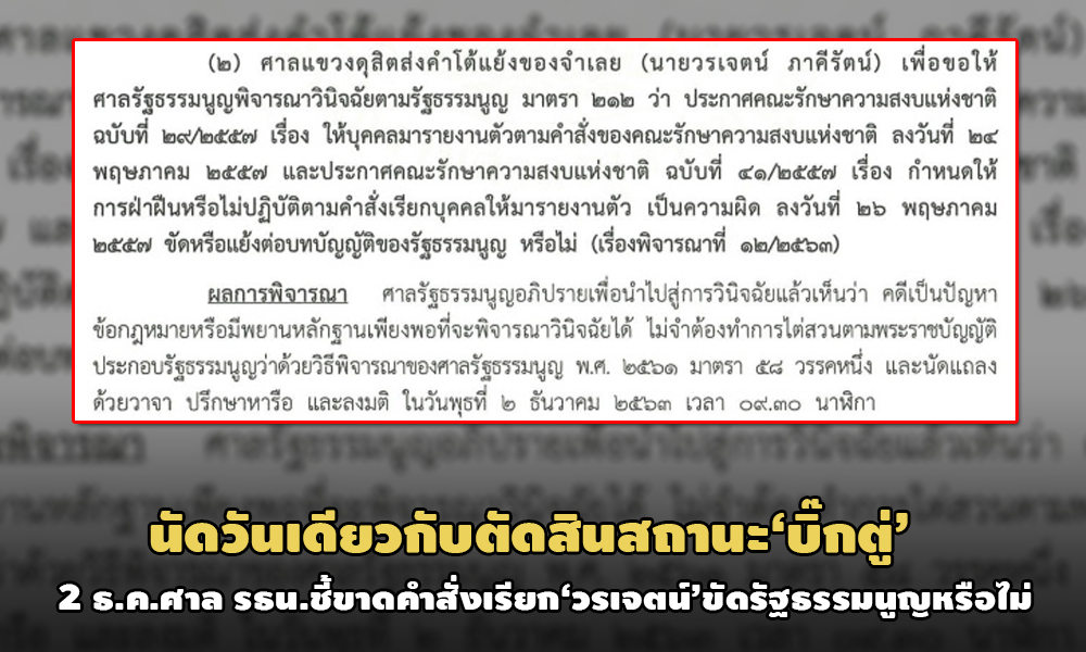 • วันเดียวกับ‘บิ๊กตู่’! 2 ธ.ค.ศาล รธน.ชี้ขาดคำสั่ง คสช.เรียก‘วรเจตน์’ขัดรัฐธรรมนูญหรือไม่