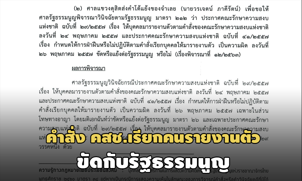 โดยศาลรัฐธรรมนูญ เห็นว่า กรณีประกาศ คสช. ฉบับที่ 29/2557 เรื่องให้บุคคลมารายงานตัวตามคำสั่งของ คสช. ลงวันที่ 24 พ.ค. 2557 และประกาศ คสช. ฉบับที่ 41/2557 เรื่อง กำหนดให้การฝ่าฝืนหรือไม่ปฏิบัติตามคำสั่งเรียกบุคคลให้มารายงานตัว เป็นความผิด ลงวันที่ 26 พ.ค. 2557 เฉพาะในส่วนโทษทางอาญา
