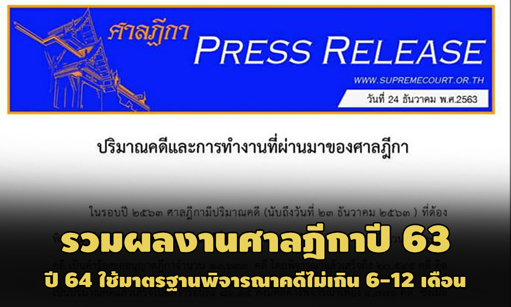 ศาลฎีกาแพร่ผลงานรอบปี 63 เผยพิจารณาคดีเสร็จสิ้นกว่า 2 หมื่นคดี จาก 2.5 หมื่น คิดเป็น 81.15% ยันคงไว้ซึ่งคุณภาพคำพิพากษาในเวลาเหมาะสม ปี 64 เล็งคลอดมาตรฐานการพิจารณาคดีไว้ในชั้นฎีกาต้องไม่เกิน 12 เดือน ส่วนคดีที่จำเลยถูกคุมขังระหว่างพิจารณาต้องแล้วเสร็จไม่เกิน 6 เดือน อ่านคำพิพากษาผ่านระบบวีดีโอคอนเฟอร์เรนซ์ด้วย