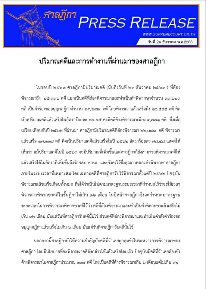 ผู้สื่อข่าวรายงานว่า เมื่อวันที่ 24 ธ.ค. 2563 ศาลฎีกาเผยแพร่ปริมาณคดีและการทำงานที่ผ่านมาของศาลฎีกาในรอบปี 2563 (นับถึงวันที่ 23 ธ.ค. 2563) พบว่า มีคดีทีต้องพิจารณา 25,316 คดี แยกเป็นคดีทีต้องพิจารณาและทำคำพิพากษารวม 11,623 คดี เป็นคำร้องขออนุญาตฎีกา 13,693 คดี โดยพิจารณาแล้วเสร็จ 20,545 คดี คิดเป็น 81.15% คงมีคดีค้างพิจารณา 4,771 คดี เมื่อเปรียบเทียบกับปี 2562 ที่ผ่านมา ศาลฎีกามีคดีที่ต้องพิจารณา 22,091 คดี พิจารณาแล้วเสร็จ 17,338 คดี คิดเป็น 78.48% แสดงให้เห็นว่า แม้ปริมาณคดีในปี 2563 จะเพิ่มมากขึ้น แต่ศาลฎีกายังสามารถพิจารณาให้แล้วเสร็จได้ในอัตราเพิ่มขึ้นถึง 2.69% และยังคงไว้ซึ่งคุณภาพของคำพิพากษาศาลฎีกา ภายในระยะเวลาที่เหมาะสม