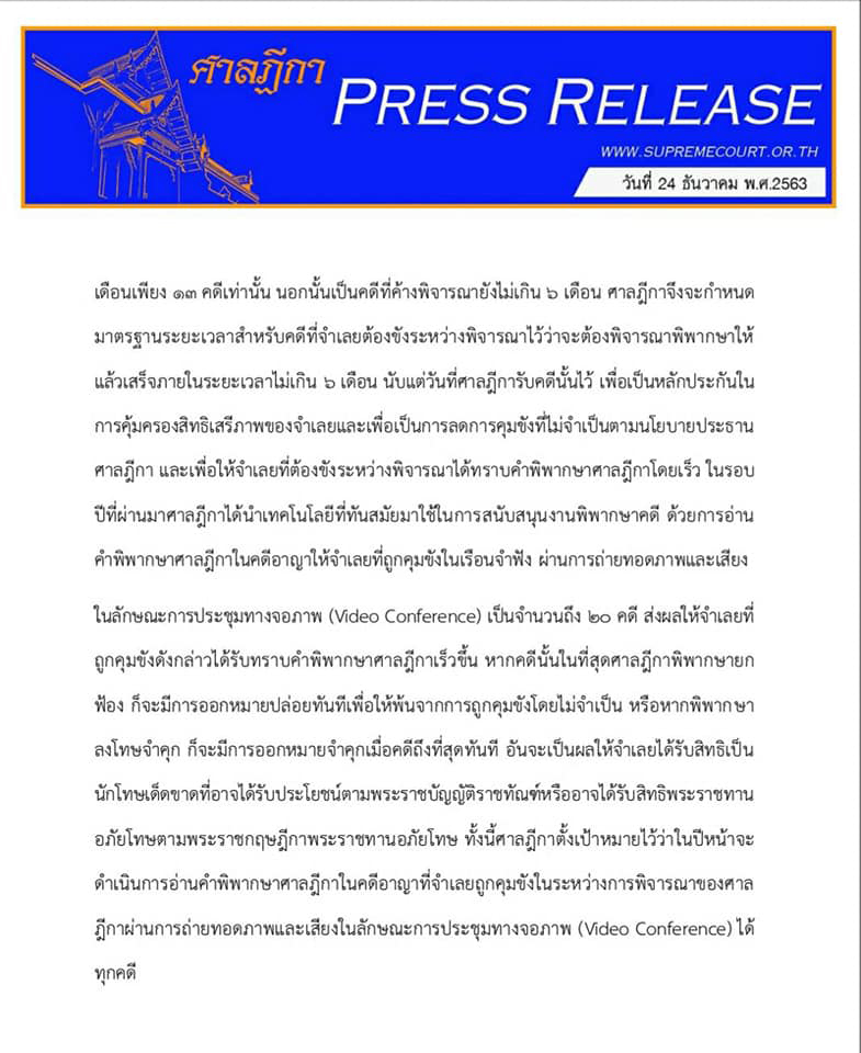 ในรอบปี 2563 ที่ผ่านมา ศาลฎีกานำเทคโนโลยีทันสมัยมาใช้ในการสนับสนุนงานพิพากษาคดี ด้วยการอ่านคำพิพากษาศาลฎีกาในคดีอาญาที่จำเลยถูกคุมขังในเรือนจำฟัง ผ่านการถ่ายทอดภาพและเสียงในลักษณะประชุมทางจอภาพ (Video Conference) เป็นจำนวน 20 คดี ส่งผลให้จำเลยได้รับทราบคำพิพากษาเร็วขึ้น หากคดีนั้นในที่สุดศาลฎีกาพิพากษายกฟ้อง จะมีการออกหมายปล่อยทันทีเพื่อให้พ้นจากการถูกคุมขังโดยไม่จำเป็น หรือหากคำพิพากษาลงโทษจำคุก จะมีการออกหมายจำคุกเมื่อคดีถึงที่สุดทันที อันจะเป็นผลให้จำเลยรับสิทธิเป็นนักโทษเด็ดขาดที่อาจได้รับประโยชน์ตาม พ.ร.บ.ราชทัณฑ์ฯ หรืออาจได้รับสิทธิพระราชทานอภัยโทษตาม พ.ร.ฎ.พระราชทานอภัยโทษฯ