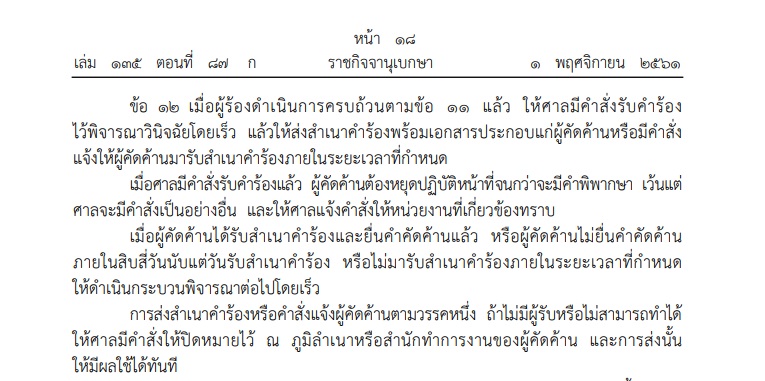 ข้อ 12 ระบุว่า เมื่อผู้ร้องดำเนินการครบถ้วนตามข้อ 11 แล้ว ให้ศาลมีคำสั่งรับคำร้องไว้พิจารณาโดยเร็ว แล้วให้ส่งคำร้องพร้อมเอกสารประกอบแก่ผู้คัดค้านหรือมีคำสั่งแจ้งให้ผู้คัดค้านมารับสำเนาคำร้องภายในเวลากำหนด