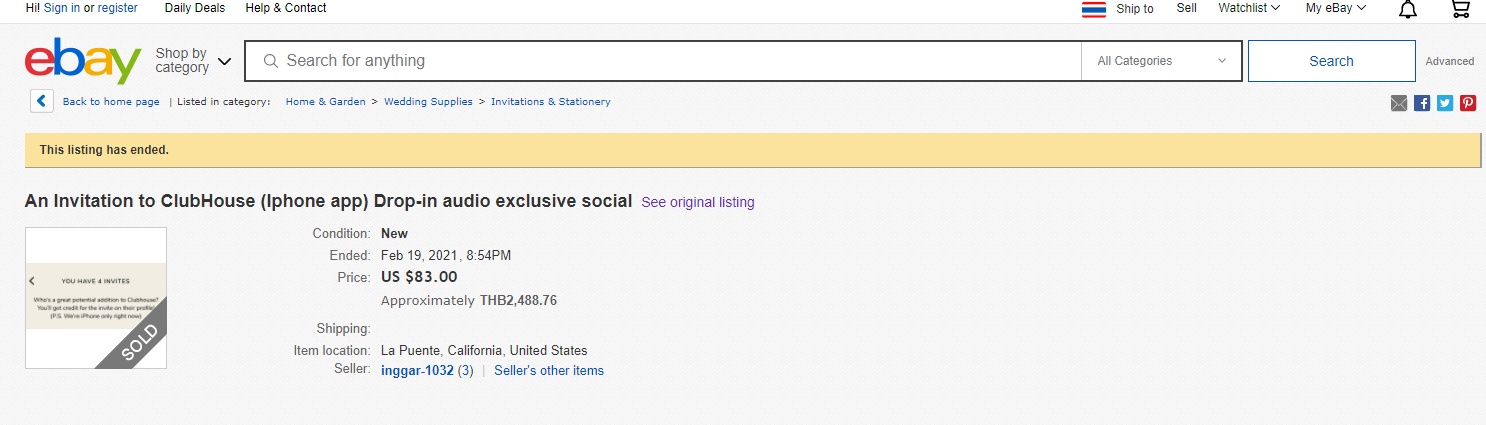 บัตรรับเชิญคลับเฮ้าส์บนเว็บไซต์อีเบย์