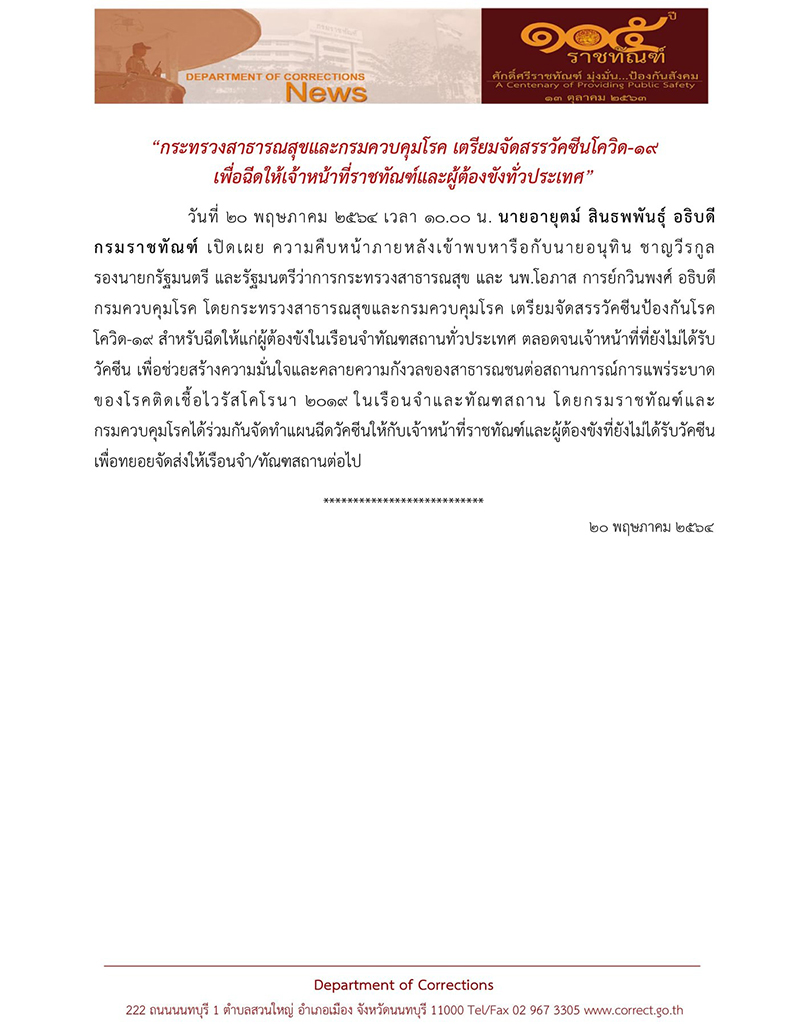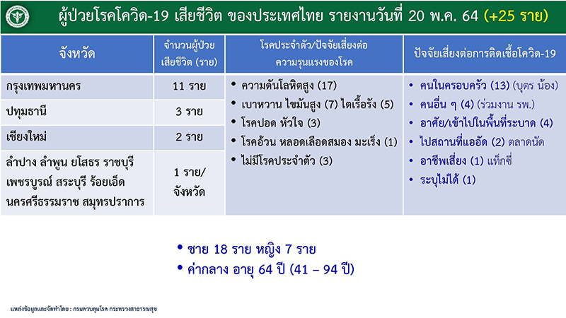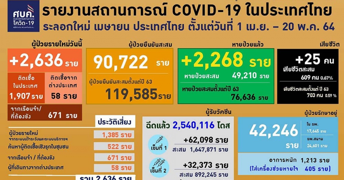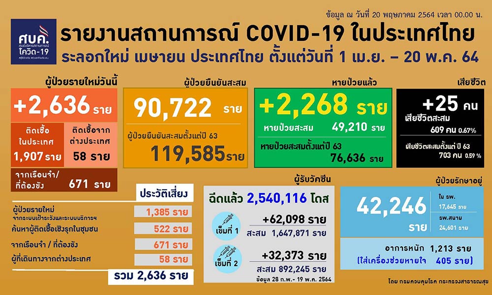 • ติดโควิดเพิ่ม 2,636 รวมสะสม 119,585 ตายอีก 25 ราย เผยเตรียมฉีดวัคซีนในเรือนจำ