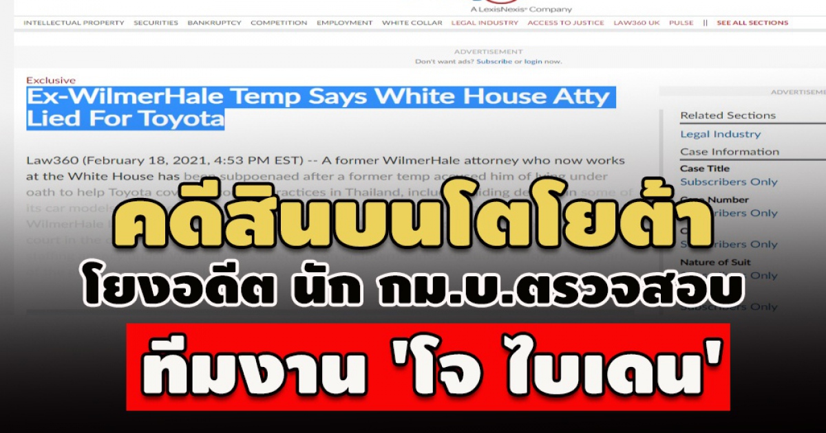 ล่าสุด ผู้สื่อข่าวสำนักข่าวอิศรา ย้อนกลับไปตรวจสอบข้อมูลในเว็บไซต์ LAW360 อีกครั้งหนึ่ง พบว่าในช่วงเดือนกุมภาพันธ์ 2564 เว็บไซต์ LAW360 เคยนำเสนอบทความหัวข้อว่า “อดีตพนักงานชั่วคราวของวิลเมอร์ เฮล กล่าวว่านักกฎหมายที่ทำเนียบข่าวนั้นมีการโกหกเพื่อโตโยต้า” (Ex-WilmerHale Temp Says White House Atty Lied For Toyota) โดยผู้เขียนบทความชิ้นนี้ ก็คือ นายแฟรงค์ จี. รันยอน (Frank G. Runyeon) ผู้สื่อข่าวของเว็บไซต์ LAW360 ที่เป็นผู้เขียนบทความเรื่องความเป็นไปได้ว่าบริษัทลูกของโตโยต้าอาจมีการให้สินบนกับผู้พิพากษาระดับสูงของประเทศไทยนั่นเอง