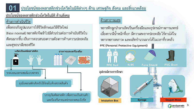 นายวีระ ขวัญเลิศจิตต์ ผู้อำนวยการสถาบันพลาสติก กล่าวว่าการแพร่ระบาดของโรคโควิดที่เกิดขึ้นต่อเนื่องหลายระลอก แพร่ระบาดไปในวงกว้างอย่างรวดเร็ว ส่งผลกระทบต่อเศรษฐกิจ สังคม และสิ่งแวดล้อมในหลากหลายมุม จนต้องมีการปรับเปลี่ยนพฤติกรรมการใช้ชีวิตสู่วิถีชีวิตใหม่ (New Normal) ความต้องการด้านสุขอนามัยและความปลอดภัยมีเพิ่มสูงขึ้น และพลาสติกก็จัดเป็นวัสดุชนิดหนึ่งที่สามารถตอบสนองความต้องการดังกล่าวในด้านของบรรจุภัณฑ์เกี่ยวกับอาหารและเพื่อการขนส่ง รวมกระทั่งอุปกรณ์ทางการแพทย์ จึงมีการอุปโภคกันเพิ่มขึ้นอย่างมาก เพื่อให้การใช้พลาสติกเกิดประโยชน์สูงสุด และมีการบริหารจัดการขยะที่ถูกต้องเหมาะสม การทำความเข้าใจในตัวพลาสติกและคุณค่าที่มีจึงเป็นสิ่งสำคัญ