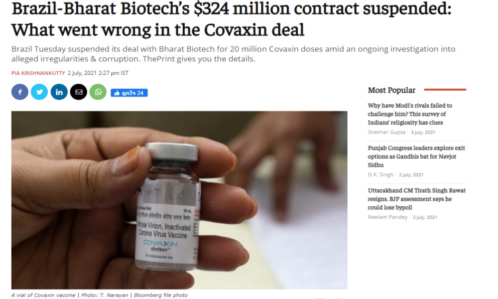 ทั้งนี้ประเด็นความไม่ชอบมาพากลระหว่างประเทศบราซิลกับการทำสัญญากับบริษัทภารัต ไบโอเทค นั้นถือว่ามีความเป็นไปเป็นมาได้หลายเดือนแล้ว โดยสำนักข่าว The Print ได้นำเสนอรายละเอียดเอาไว้ดังนี้