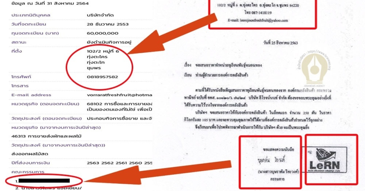 3. ในฐานข้อมูลออนไลน์จดทะเบียนจัดตั้งบริษัทเอกชน ของกรมพัฒนาธุรกิจการค้า ไม่พบข้อมูล บริษัทลีโรจน์นนท์ จำกัด แต่พบข้อมูล บริษัท ลีโรจน์นนท์ เฟรชฟรุ๊ต จำกัด ระบุว่า จดทะเบียนจัดตั้ง 28 ตุลาคม 2559 ทุนปัจจุบัน 5,000,000 บาท ตั้งอยู่เลขที่ 50/1 หมู่ 3 ตำบลช่องไม้แก้ว อำเภอทุ่งตะโก จังหวัดชุมพร แจ้งประกอบธุรกิจขายส่งผักและผลไม้