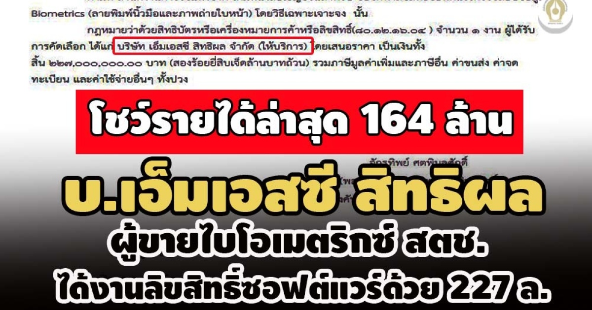 "...ล่าสุด สำนักข่าวอิศรา ตรวจสอบพบข้อมูลใหม่ว่า ณ วันที่ 19 ก.พ. 64 บริษัท เอ็มเอสซี สิทธิผล จำกัด ปรากฏชื่อเป็นคู่สัญญา ซื้อจัดหาลิขสิทธิ์ซอฟต์แวร์ตรวจสอบข้อมูล Biometrics (ลายพิมพ์นิ้วมือและภาพถ่ายใบหน้า) โดยวิธีเฉพาะเจาะจง ของ สำนักงานตำรวจแห่งชาติ (สตช.) วงเงิน 227,000,000 บาท ตามสัญญาเลขที่ 02/2564 ..."