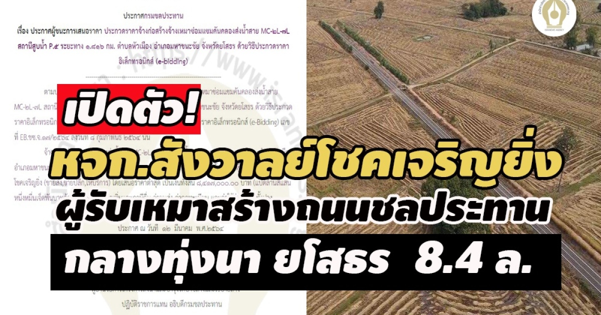 "...โครงการฯ นี้มีชื่อเป็นทางการว่า ประกวดราคาจ้างก่อสร้างจ้างเหมาซ่อมแซมคันคลองส่งน้ำสาย MC-2L-7L สถานีสูบน้ำ P.5 ระยะทาง 1.816 กม. ตำบลหัวเมือง อำเภอมหาชนะชัย จังหวัดยโสธร คู่สัญญา คือ หจก.สังวาลย์โชคเจริญยิ่ง ประกาศผลเป็นทางการ เมื่อวันที่ 12 มีนาคม 2564 ลงนามในสัญญา วันที่ 26 เมษายน 2564 วงเงินตามสัญญาจ้าง 8,417,000 บาท ..."
