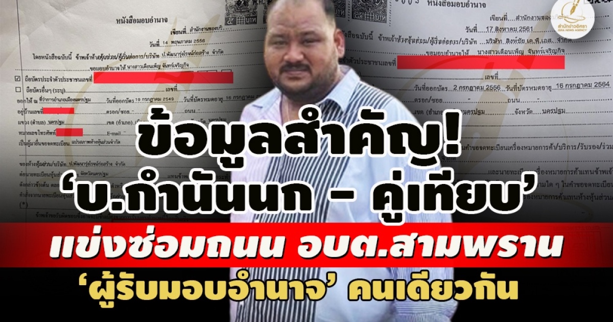 พบข้อมูลสำคัญ! ป.พัฒนารุ่งโรจน์ฯ ‘กำนันนก’ - ‘สิงห์ชัย เค.พี.เอส.’ คู่เทียบ ปูมหลังใช้บุคคล‘ผู้รับมอบอำนาจ-พยานลงชื่อในเอกสาร’ยื่นจดทะเบียนฯ คนเดียวกัน ต่อมาร่วมประกวดราคารับเหมาซ่อมถนนลาดยางแอสฟัลท์ อบต.สามพราน จ.นครปฐม 9.8 ล. ปี 2565 เคาะห่างกัน 30,000 บาท