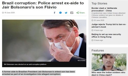 ส่องคดีทุจริตโลก สำนักข่าวอิศรา (www.isranews.org) ประจำสัปดาห์นี้ขอนำเสนอกรณีการทุจริตอันเกี่ยวข้องกับคนใกล้ตัวของนายฌาอีร์ โบลโซนารู ประธานาธิบดีบราซิล ที่กำลังเป็นที่วิพากษ์วิจารณ์อย่างหนัก ถึงความไร้ประสิทธิภาพต่อสถานการณ์การแพร่ระบาดของไวรัสโคโรน่า หรือโควิด 19 ที่ขณะนี้มีชาวบราซิลติดเชื้อไปแล้วมากกว่า 1 ล้านราย