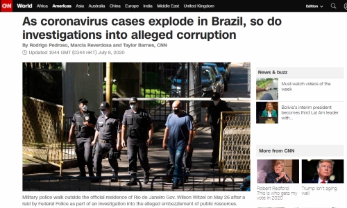 โดยสำนักข่าวซีเอ็นเอ็นของสหรัฐอเมริกาได้ทำรายงานข่าวเมื่อวันที่ 8 ก.ค. ว่าในช่วง 2 เดือนที่ผ่านมา สำนักงานอัยการประเทศบราซิลได้สอบสวนคดีการทุจริตของหน่วยงานรัฐอันเกี่ยวข้องกับไวรัสโควิด 19 จำนวนเกือบ 1,500 คดี ในทุกระดับของหน่วยงานราชการ ซึ่งรายละเอียดคดีส่วนใหญ่จะเป็นข้อหาการใช้งบประมาณแผ่นดินผิดประเภท การทุจริต การจัดซื้อจัดจ้างเกินราคา และการฟอกเงิน