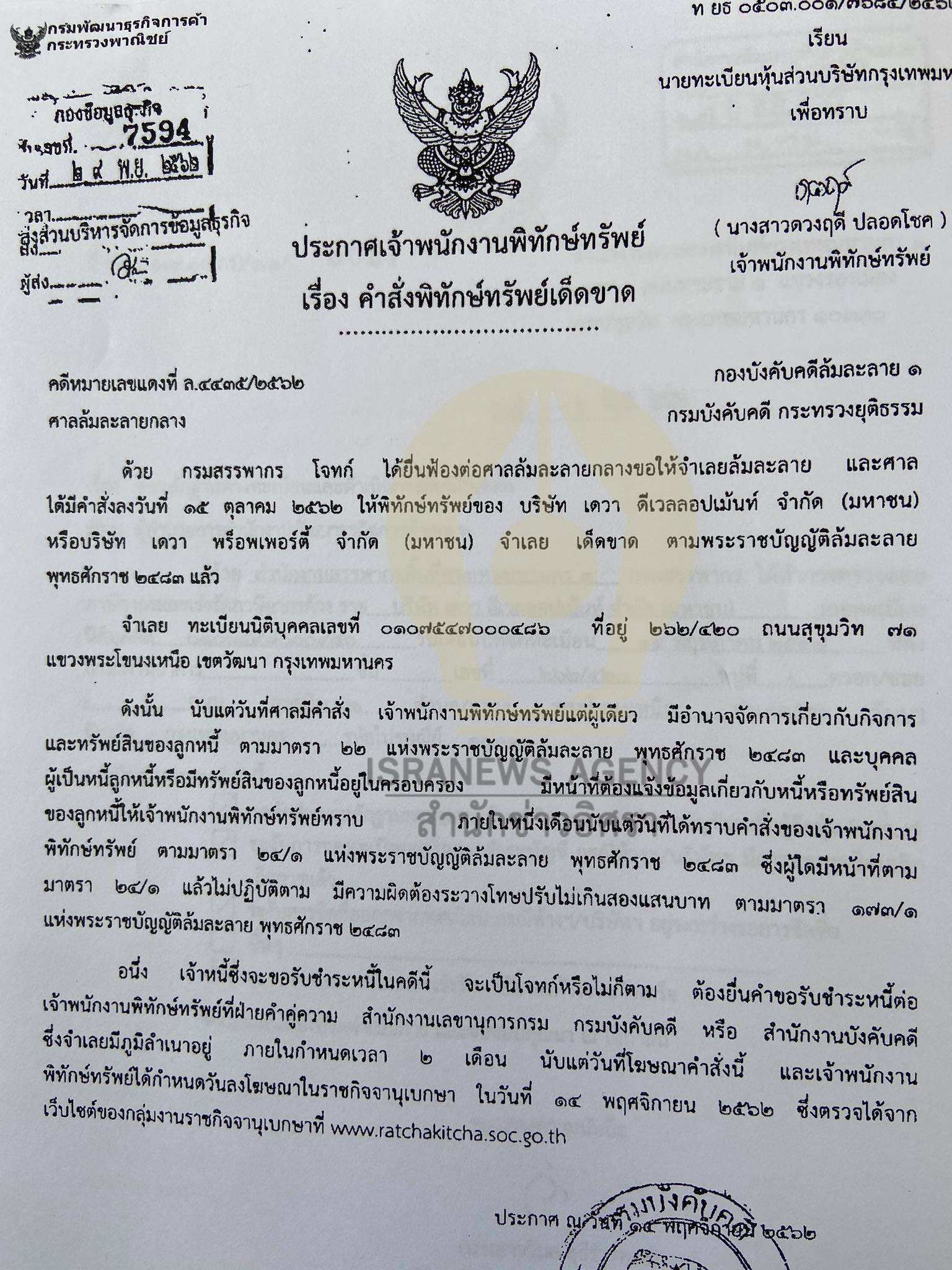 เมื่อวันที่ 15 ต.ค.2562 ศาลล้มละลายกลางมีคำสั่งพิทักษ์ทรัพย์ บริษัท เดวา ดีเวลลอปเม้นท์ จำกัด (มหาชน) เด็ดขาด โดย กรมสรรพากร โจทก์ (อ่านข่าวเกี่ยวข้อง: ศาลสั่งพิทักษ์ทรัพย์ บมจ.เดวาฯ อดีตรับเหมาใหญ่-เคยค้ำประกันเงินกู้ 1,700 ล. ธ.อิสลามฯ)