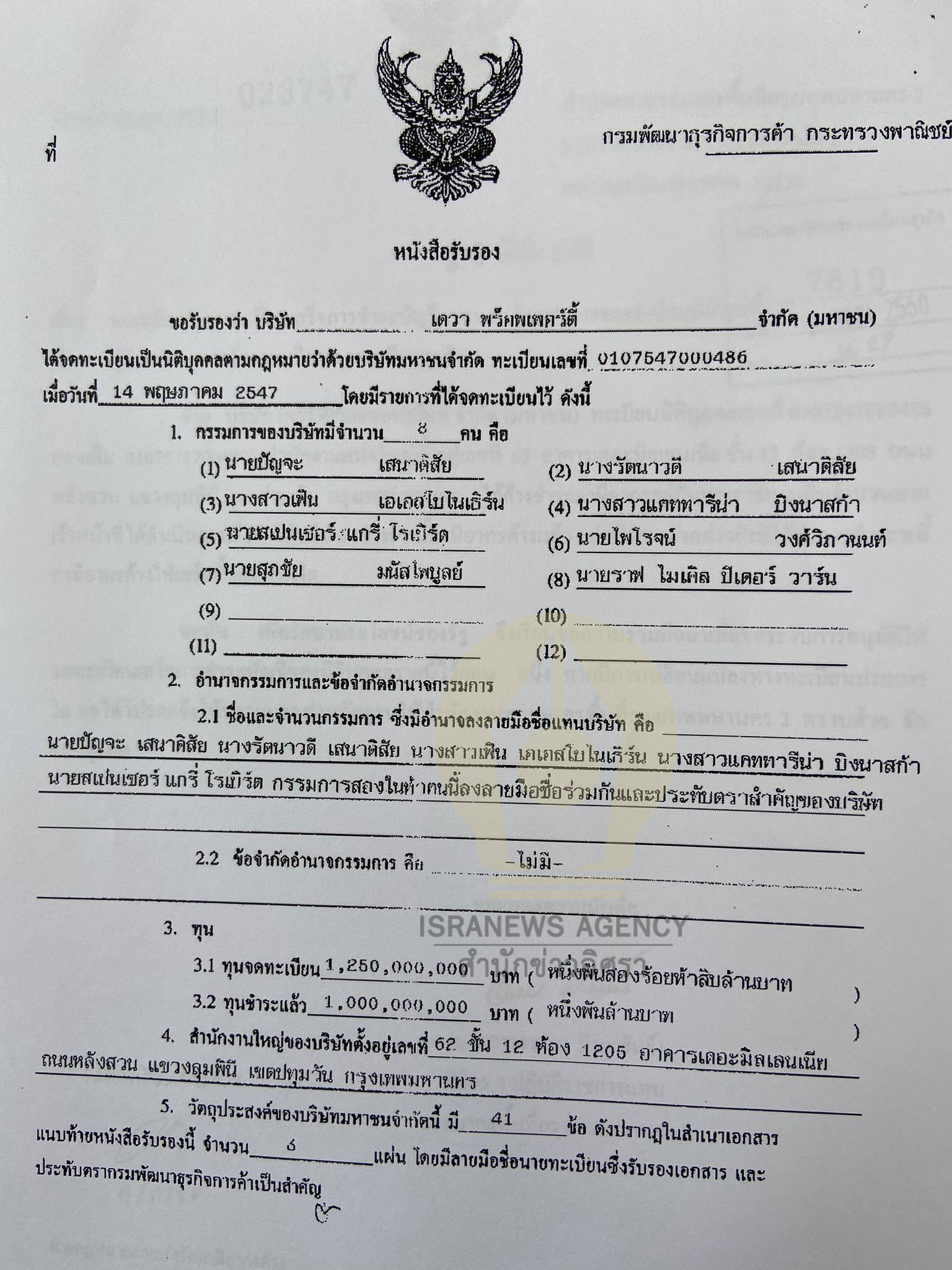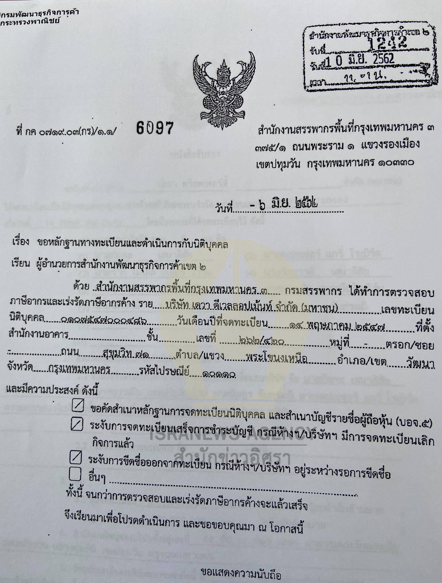 บริษัท เดวา ดีเวลลอปเม้นท์ จำกัด (มหาชน) ถูกกรมสรรพากร ทำหนังสือถึงนายทะเบียน กรมพัฒนาธุรกิจการค้า ขอหลักฐานรายชื่อ ผู้ถือหุ้น กรรมการบริษัท และระงับการจดทะเบียนเลิกกิจการ ตั้งแต่ ปี 2550- 30 ต.ค.2563 จำนวน 35 ครั้ง