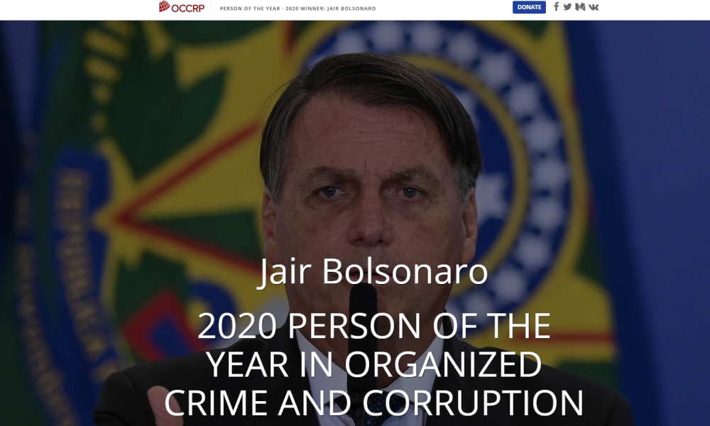 นายณาอีร์ โบลโซนารู ประธานาธิบดีบราซิล ถูกคัดเลือกจากสำนักข่าว OCCRP ให้เป็นบุคคลแห่งปี เนื่องจากบทบาทของเขาในด้านการสนับสนุนองค์กรซึ่งมีความเกี่ยวข้องกับการทุจริตและอาชญากรรม