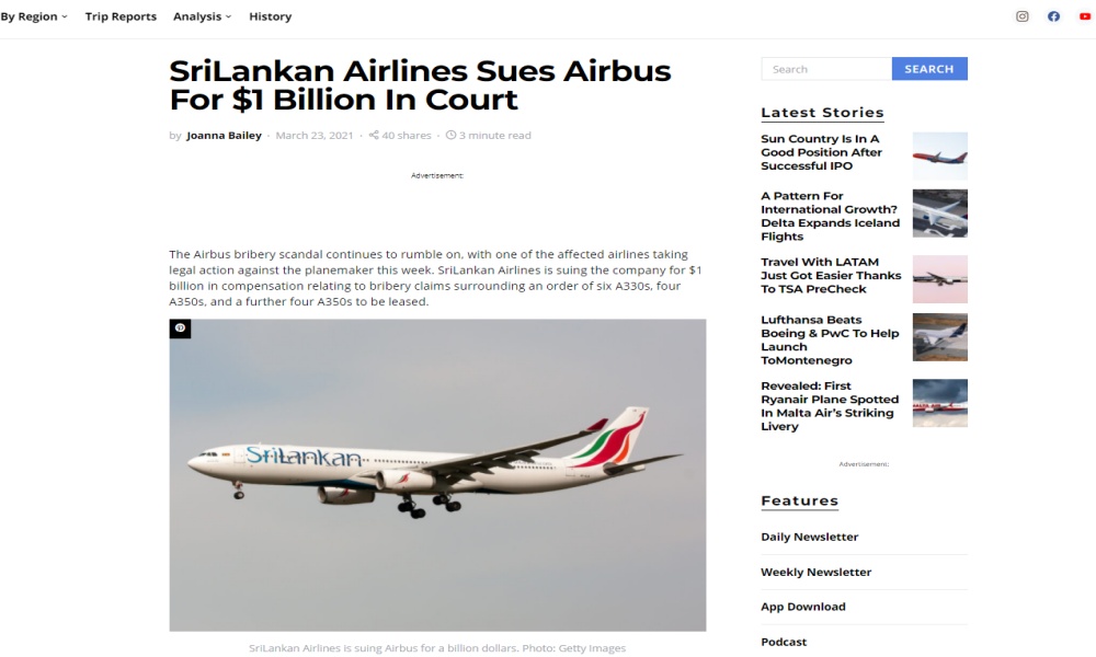 โดยล่าสุดเว็บไซต์ Simpleflying ที่เป็นเว็บไซต์รวบรวมข้อมูลข่าวสารเกี่ยวกับแวดวงการบินทั่วโลกได้รายงานข่าวว่าสายการบินศรีลังกาแอร์ไลน์ซึ่งเป็นหนึ่งในสายการบินที่ได้รับผลกระทบได้มีการดำเนินการฟ้องร้องกับบริษัทผู้ผลิตเครื่องบินเมื่อสัปดาห์ที่ผ่านมา โดยจำนวนเงินทั้งสิ้น 1 พันล้านดอลลาร์สหรัฐอเมริกา (31,080,000,000 บาท) เพื่อให้เป็นค่าชดใช้ต่อกรณีข้อกล่าวหาการเรียกรับสินบนในการจัดซื้อเครื่องบินรุ่น A330 จำนวน 6 ลำ,เครื่องบินรุ่น A350 จำนวน 4 ลำ และการให้เช่าเครื่องบินรุ่น A350 เพิ่มเติมอีกจำนวน 4 ลำ