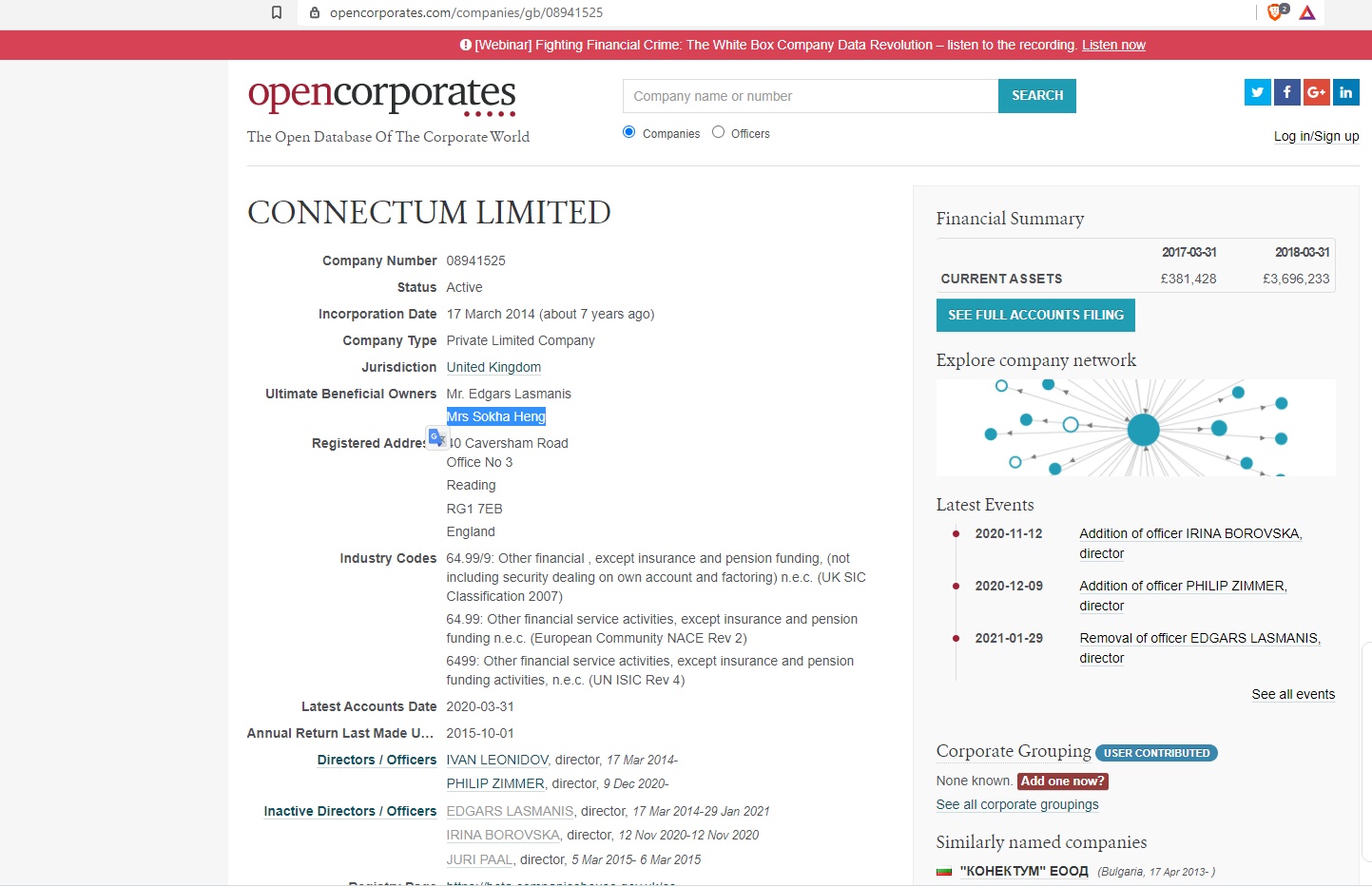 โดยนาง Heng Sokha ภรรยาของนาย Ing Bun Hoaw อดีตรัฐมนตรีว่าการกระทรวงคมนาคม ได้เข้าไปถือความเป็นเจ้าของของบริษัทคอนเนคทัมนับตั้งแต่ในช่วงเดือน พ.ย. 2563 ที่ผ่านมา ในขณะที่ผู้เชี่ยวชาญได้ออกมาเตือนให้หน่วยงานที่ทำการตรวจสอบด้านการเงินของประเทศอังกฤษได้เข้าไปตรวจสอบการถือครอบบริษัทดังกล่าว