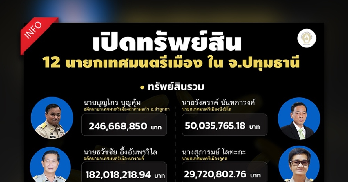 INFO : เปิดทรัพย์สิน 5 นายกเทศฯ เมืองใน จ.นนทบุรี - อดีตนายกบางกรวย มากสุด 415 ล้าน