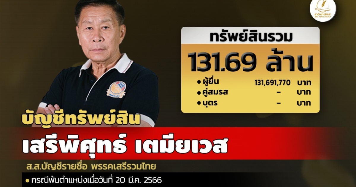 สำนักงานคณะกรรมการป้องกันและปราบปรามการทุจริตแห่งชาติ (ป.ป.ช.) เปิดเผยบัญชีแสดงทรัพย์สินและหนี้สินของ นาย เสรีพิศุทธ์ เตมียเวส ส.ส.บัญชีรายชื่อ พรรคเสรีรวมไทย โดยแจ้งมี ทรัพย์สิน 131.69 ล. ประกอบด้วย เงินสด 5 แสนบาท เงินฝาก 7 บัญชี มูลค่า 17.63 ล. ที่ดิน 63 แปลง มูลค่ารวม 44.65 ล. อาทิ ที่ดินใน จ.กรุงเทพฯ ทรัพย์สินที่น่าสนใจ พระสมเด็จวัดระฆังพร้อมสร้อยคอ และ งาช้าง 1 คู่ มิได้ระบุราคา
