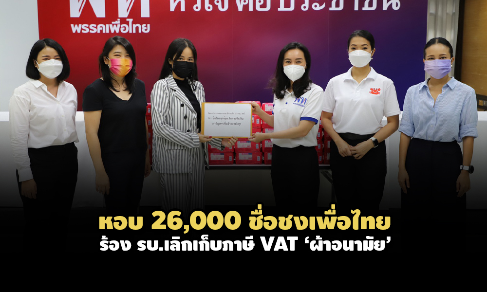 ภาค ปชช. หอบ 26,000 ชื่อผ่านเว็บ Change.org ชงเพื่อไทยเรียกร้อง รบ.ยกเลิกเก็บภาษี VAT ‘ผ้าอนามัย’ ทุกรูปแบบ เตรียมหารือร่วม กมธ.เด็ก เยาวชน สตรีฯ ผลักดันนโยบายช่วยเหลือ ชี้เสมือน ‘ปัจจัย 5’ ของผู้หญิง เผยมีราคาสูงหากเทียบกับรายได้เฉลี่ยคนไทย