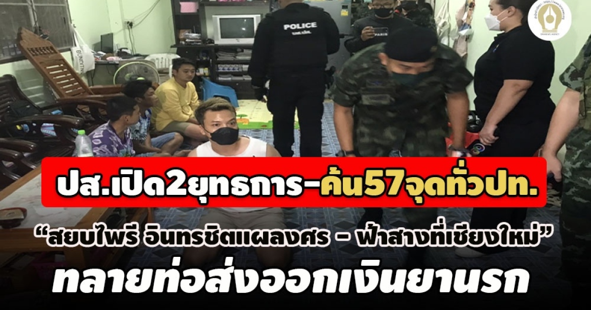 ตำรวจ ปส. เปิด 2 ยุทธการ “สยบไพรี อินทรชิตแผลงศร - ฟ้าสางที่เชียงใหม่” ลุยค้น 57 จุดทั่วปท. บุกจับเจ้าของบริษัทขนส่งพัสดุเอกชนเชียงราย ทลายท่อส่งออกเงินยานรก เชื่อมโยงเครือข่าย “เทพบุตรโซโลโก๋แก่มันทุกเม็ด”พบเงินหมุนเวียนกว่า 500 ล้าน