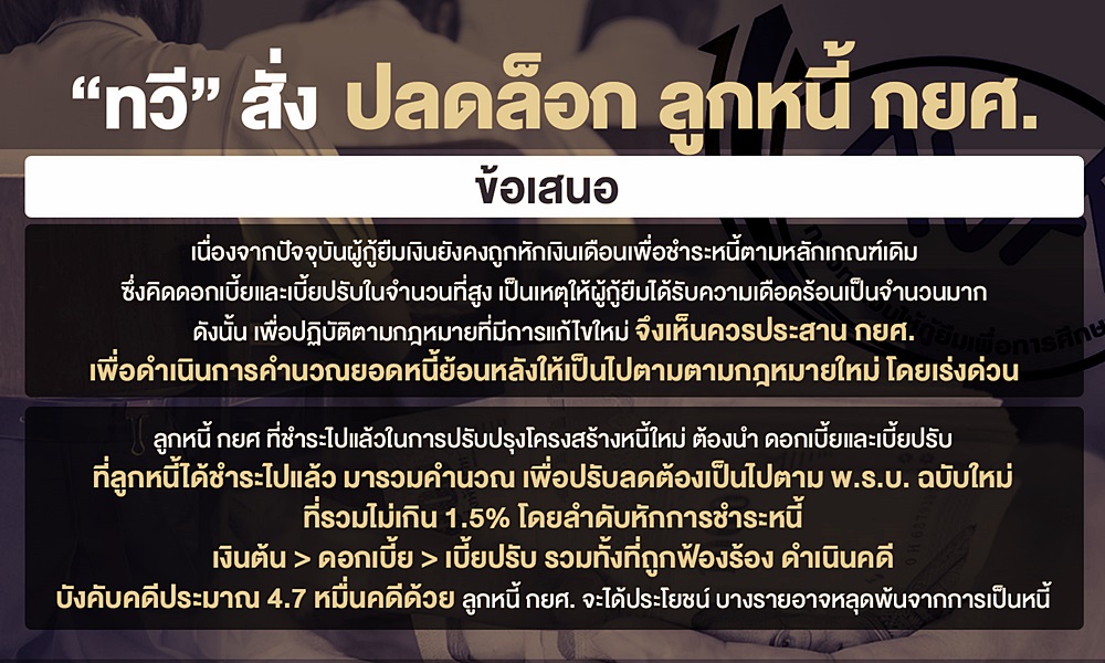 เนื่องจากปัจจุบันผู้กู้ยืมเงินยังคงถูกหักเงินเดือนเพื่อชำระหนี้ตามหลักเกณฑ์เดิม ซึ่งคิดดอกเบี้ยและเบี้ยปรับในจำนวนที่สูง เป็นเหตุให้ผู้กู้ยืมได้รับความเดือดร้อนเป็นจำนวนมาก ดังนั้นเพื่อปฏิบัติตามกฎหมายที่มีการแก้ไขใหม่ จึงเห็นควรประสาน กยศ. เพื่อดำเนินการคำนวณยอดหนี้ย้อนหลังให้เป็นไปตามตามกฎหมายใหม่โดยเร่งด่วน
