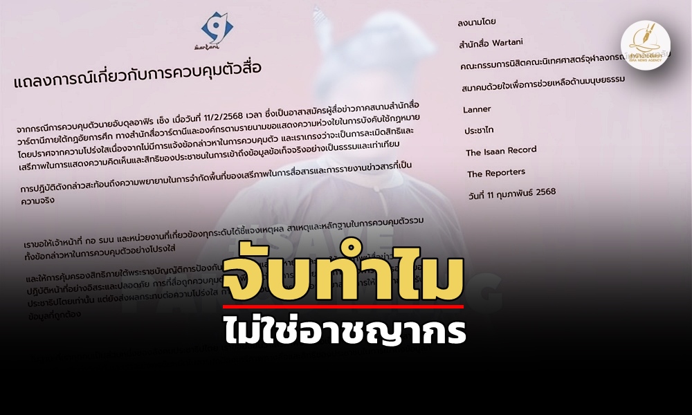WARTANI – สื่อภาคีเครือข่าย ร่อนจดหมายถึงแม่ทัพภาค 4 จี้ปล่อยตัว “นักข่าวอาสา” อย่างไม่มีเงื่อนไข พร้อมให้ชี้แจงการจับกุม ย้ำคนข่าวในพื้นที่ไม่ใช่อริราชศัตรู การรายงานข่าวไม่ใช่อาชญากรรม ด้านสถานการณ์ชายแดนใต้ยังป่วนไม่เลิก แขวนป้ายขู่ อส. 4 ตำบลของทุ่งยางแดง ปัตตานี