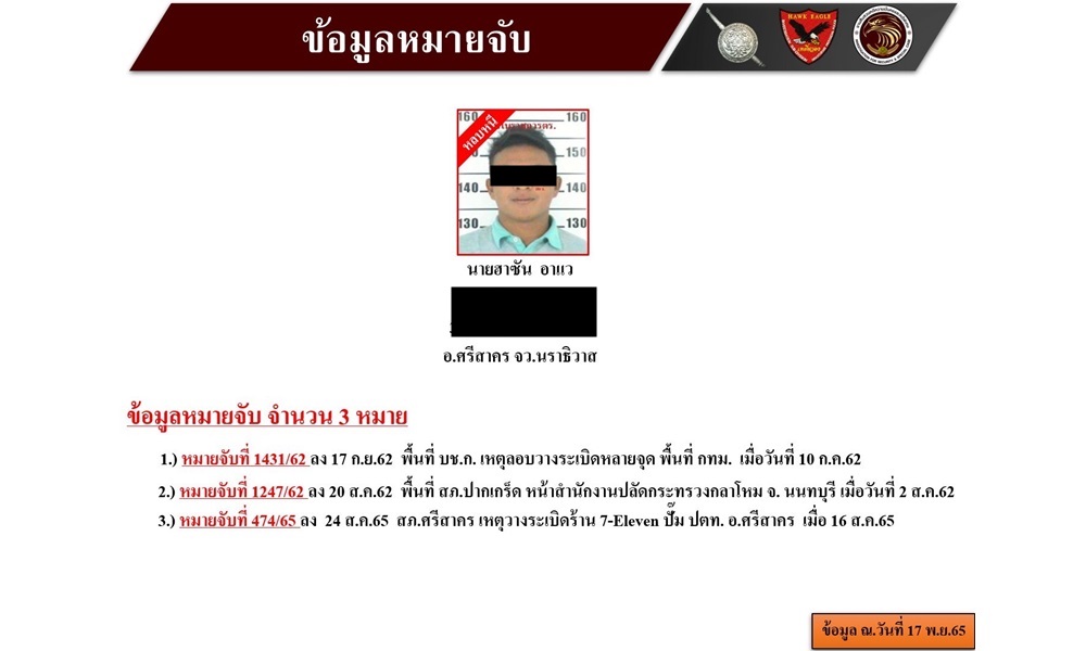 นอกจากนั้นยังพบว่า นายฮาซัน อาแว มีคดีที่เคยถูกออกหมายจับก่อนหน้านี้ เพราะเกี่ยวข้องกับเหตุระเบิดที่กรุงเทพฯ เมื่อวันที่ 1-2 ส.ค.62 โดยมีหมายจับจำนวน 2 หมาย ได้แก่ หมายจับที่ 1431/2562 ลงวันที่ 17 ก.ย.62 เหตุลอบวางระเบิดหลายจุดในกรุงเทพฯ และหมายจับที่ 1247/62 ลงวันที่ 20 ส.ค.62 พื้นที่ สภ.ปากเกร็ด จ.นนทบุรี หน้าสำนักงานปลัดกระทรวงกลาโหม จ.นนทบุรี เมื่อวันที่ 2 ส.ค.62