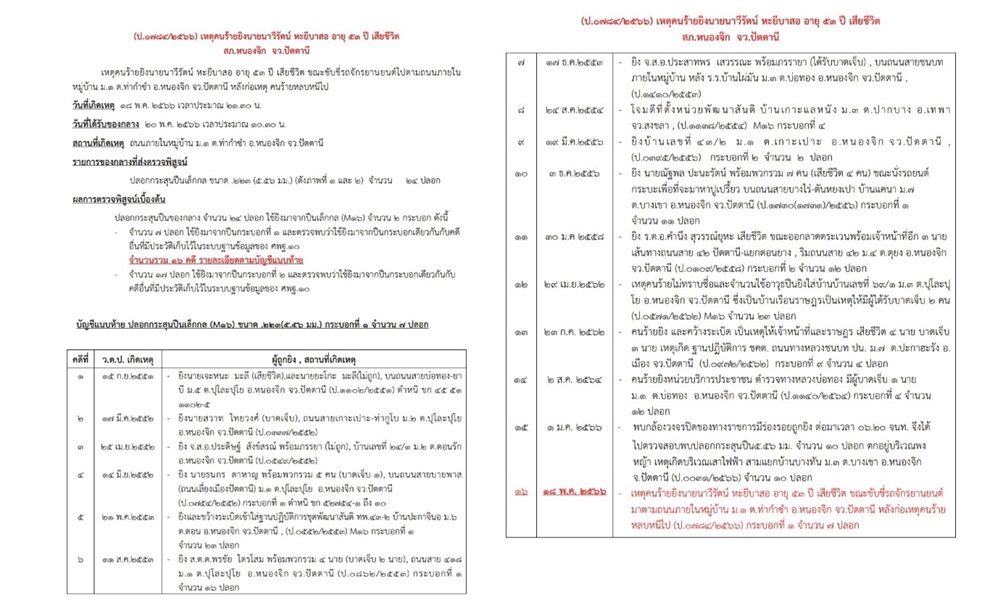 เผยผลตรวจปลอกกระสุนปืน 24 ปลอก จากเหตุยิงแพทย์ประจำตำบลท่ากำชำ หนองจิก ปัตตานี พบมาจากอาวุธปืน 2 กระบอก มีประวัติเคยก่อเหตุในพื้นที่ปัตตานี-สงขลา 3 อำเภอรอยต่อ มากกว่า 16 คดี!