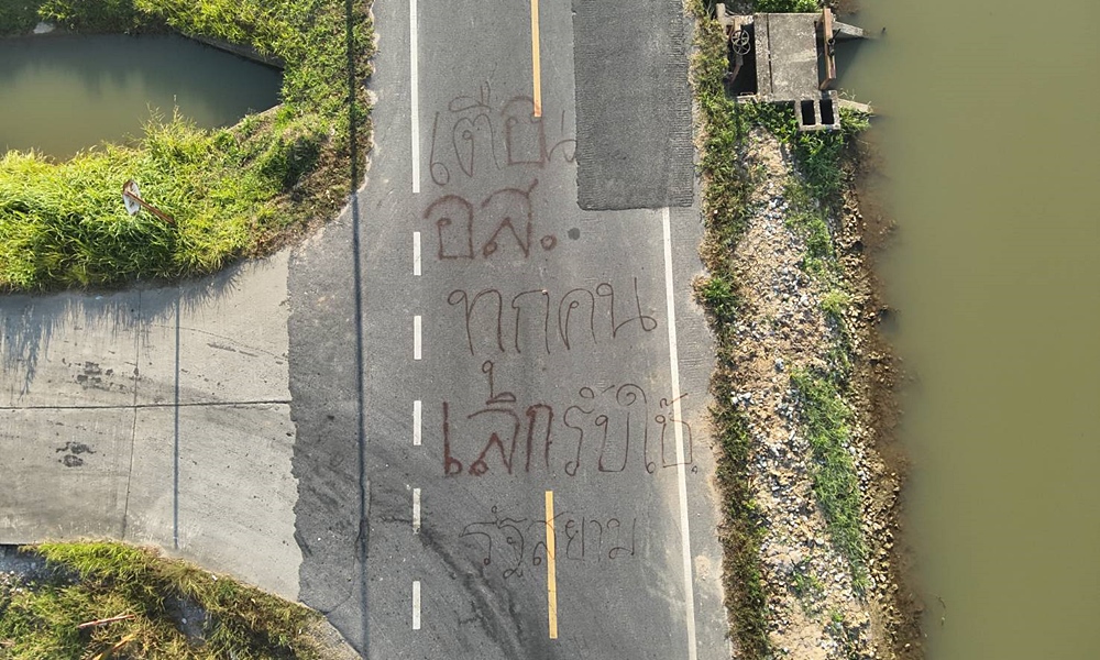 จุดที่ 1 บริเวณประตูน้ำริมคลองชลประทาน พบมีการพ่นสีสเปรย์บนถนน มีข้อความว่า “เตือน อส. ทุกคนเลิกรับใช้สยาม” และมีการวางวัตถุต้องสงสัยลักษณะเป็นทรงกระบอก ห่อด้วยถุงพลาสติกสีดำ