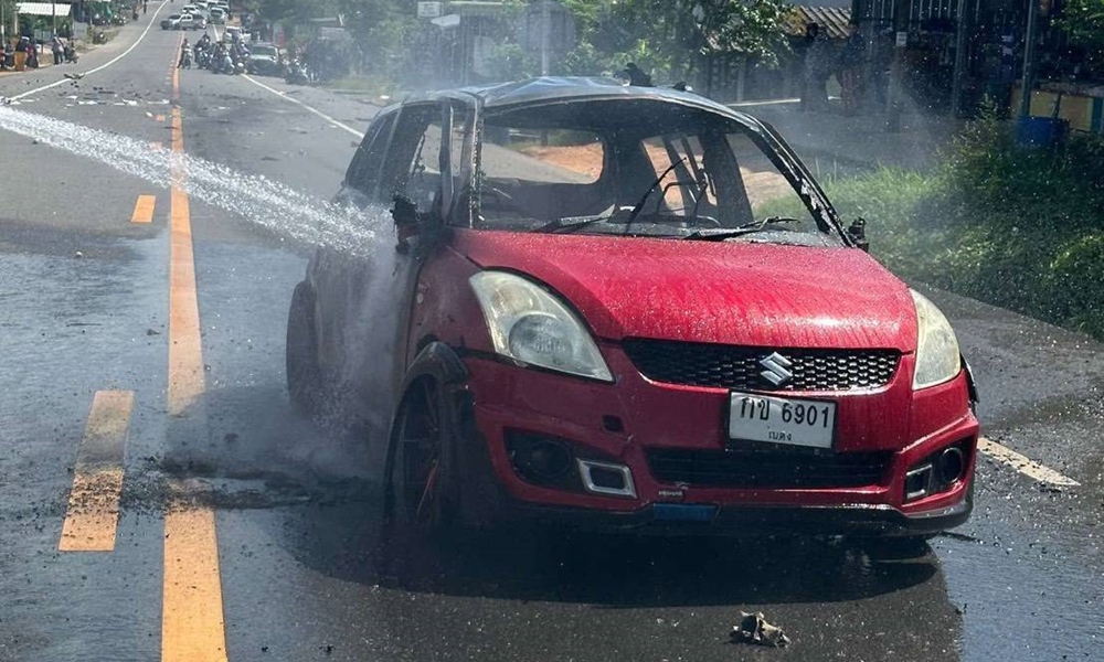 บึ้มเก๋ง อส.หญิง ขณะขับไปทำงานที่กะพ้อ ปัตตานี ไฟลุกท่วม ต้องหนีตายออกจากรถสุดระทึก คาดเป็นระเบิดแสวงเครื่องที่คนร้ายลอบติดเอาไว้ คราวนี้หวังทำร้ายตัวเจ้าหน้าที่ ย้อนหลัง ก.พ.เดือนเดียว ตูมสนั่น 5 เหตุการณ์ นราธิวาสล้วน แต่ไม่มีใครอยู่ในรถ