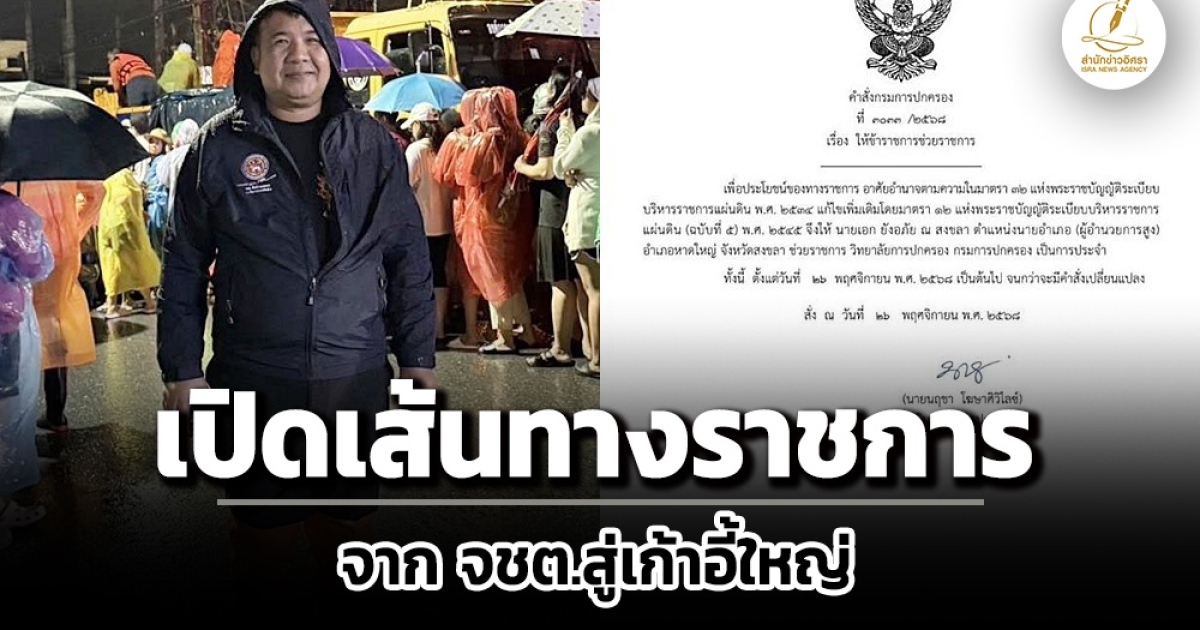 วันพุธที่ 26 พ.ย.68 นายนฤชา โฆษาศิวิไลซ์ อธิบดีกรมการปกครอง ลงนามในคำสั่งกรมการปกครอง ที่ 1033/2568 เรื่องให้ข้าราชการช่วยราชการ โดยในเอกสารระบุว่า เพื่อประโยชน์ของทางราชการ อาศัยอำนาจความในมาตรา 32 แห่งพระราชบัญญัติระเบียบบริหารราชการแผ่นดิน พ.ศ.2534 แก้ไขเพิ่มเติมโดยมาตรา 12 แห่งพระราชบัญญัติระเบียบบริหารราชการแผ่นดิน (ฉบับที่ 5) พ.ศ.2545 จึงให้ นายเอก ยังอภัย ณ สงขลา ตำแหน่งนายอำเภอ (ผู้อำนวยการสูง) อำเภอหาดใหญ่ จังหวัดสงขลา ช่วยราชการ วิทยาลัยการปกครอง กรมการปกครอง เป็นการประจำ