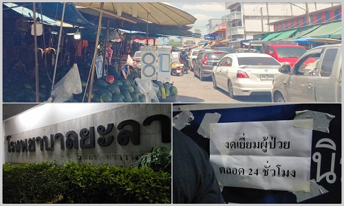 ขณะที่โรงพยาบาลยะลา หรือโรงพยาบาลศูนย์ยะลาเดิม ได้มีการแปะป้ายงดเยี่ยมคนไข้ตลอด 24 ชั่วโมง ซึ่งยังไม่ชัดว่าเป็นมาตรการที่ประกาศใช้ทั้งโรงพยาบาลเพื่อป้องกันการแพร่ระบาดของโควิด-19 หรือใช้เฉพาะบางพื้นที่เสี่ยง