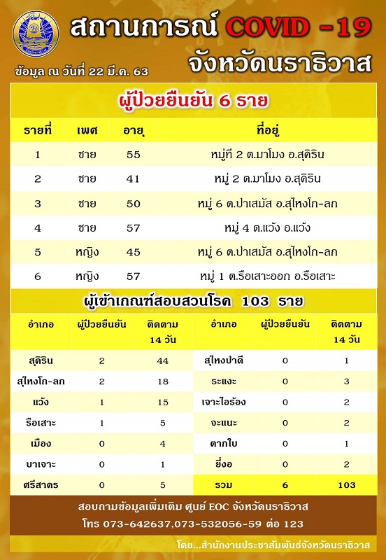 ศูนย์ปฏิบัติการภาวะฉุกเฉิน หรือ EOC COVID-19 จังหวัดนราธิวาส ได้รายงานข้อมูลสถานการณ์โรคติดเชื้อไวรัสโคโรนา 2019 หรือ โควิด-19 ณ วันที่ 22 มี.ค.63 มีผู้ป่วยยืนยันติดเชื้อจำนวน 6 ราย และผู้ป่วยเข้าเกณฑ์สอบสวนเฝ้าระวัง จำนวน 103 ราย ทำให้ทางจังหวัดเร่งปฏิบัติการเชิงรุก ลงพื้นที้สร้างความตระหนักแก่ชุมชน พร้อมแนะนำประชาชน "อยู่บ้าน หยุดเชื้อ เพื่อชาติ"