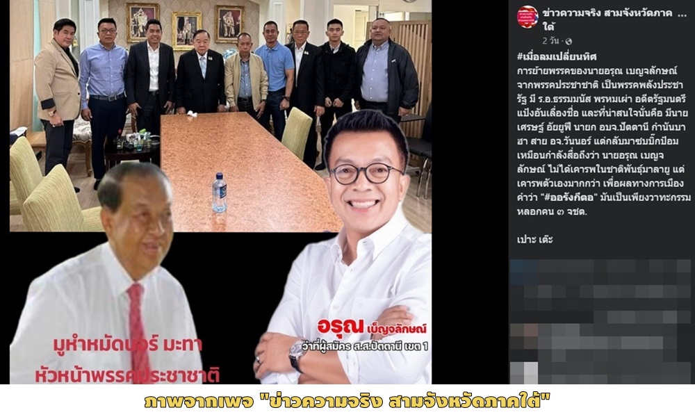 แต่ล่าสุดเมื่อ นายอรุณ เบ็ญจลักษณ์ ย้ายจากพรรคประชาชาติไปลงพลังประชารัฐที่ เขต 1 ปัตตานี กลับปรากฏภาพ “นายกเศรษฐ์” รวมถึง นายอรุณ ไปยืนเรียงหน้าร่วมกับ “ลุงป้อม” ที่บ้านป่ารอยต่อฯ โดยมีแกนนำระดับ “คีย์แมน” ของพรรคพลังประชารัฐร่วมเฟรมพร้อมหน้า