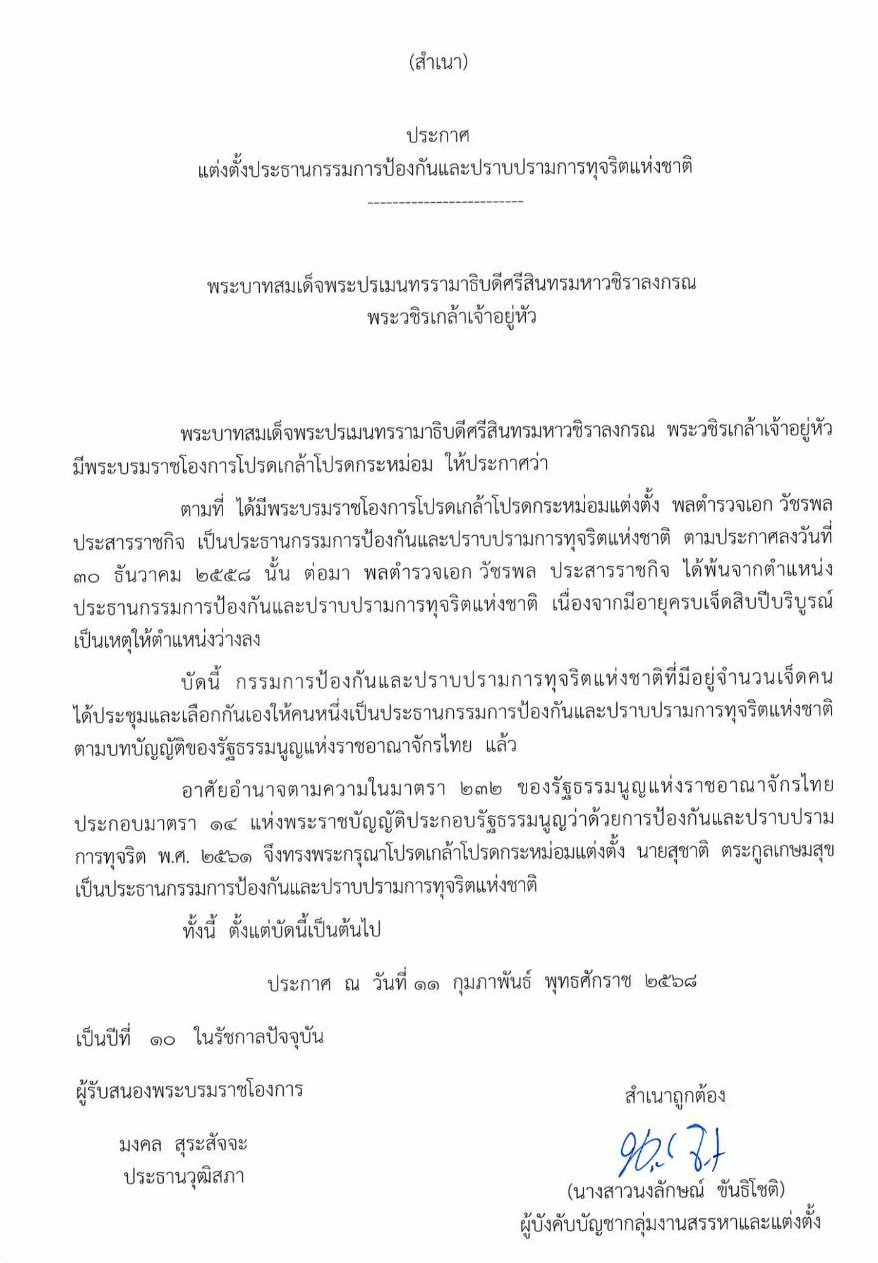 - ค่ำวันอังคาร มีพระบรมราชโองการโปรดเกล้าฯ แต่งตั้งประธาน ป.ป.ช.