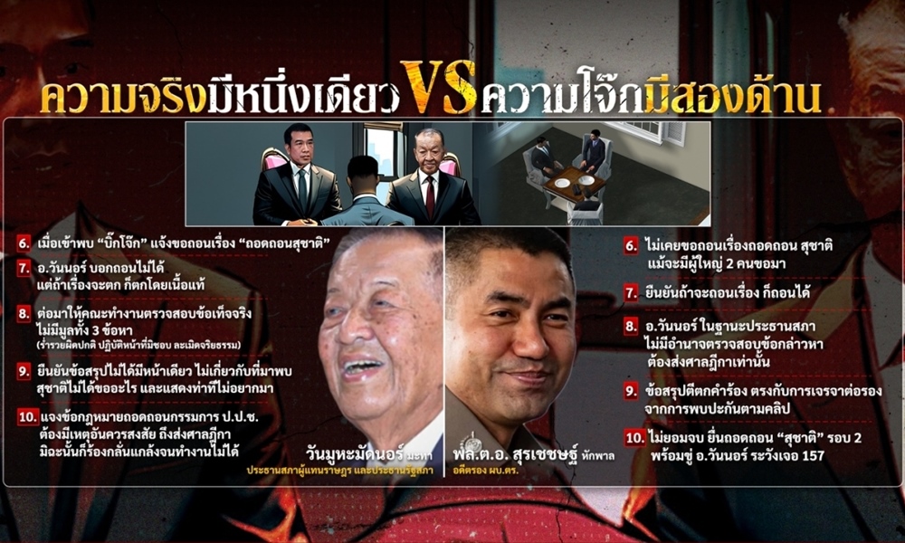 - ยืนยันข้อสรุปไม่ได้มีหน้าเดียว ไม่เกี่ยวกับที่มาพบ นายสุชาติไม่ได้ขออะไร และแสดงท่าทีไม่อยากมา
