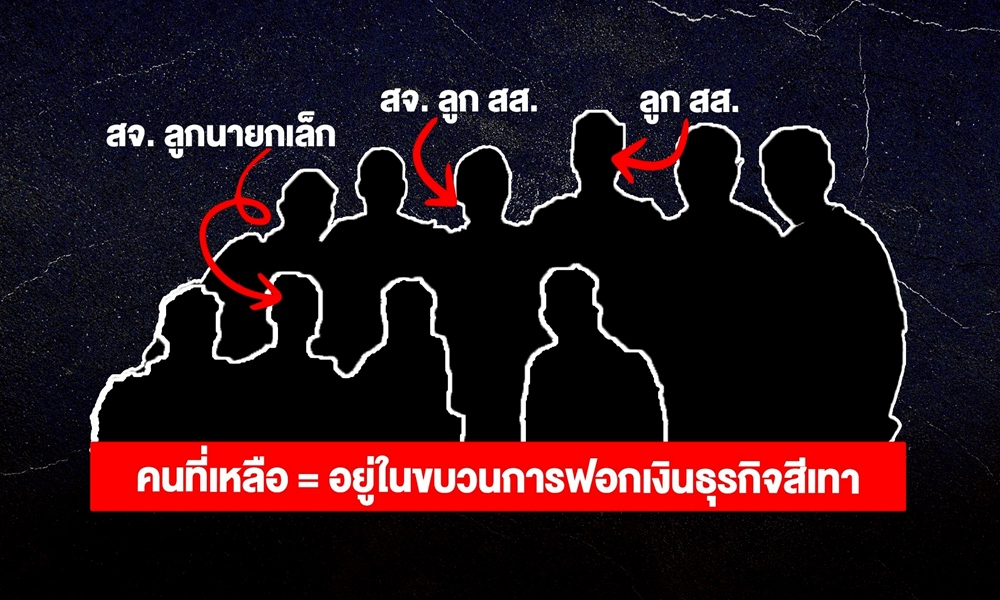 - คนที่สาม “นาย อ.” ลูกชายนักการเมืองท้องถิ่นดนดัง จากพรรคการเมืองใหญ่ในรัฐบาล ชาวบ้านรู้กันดีว่าเป็นหัวโจกขบวนการ “เงินเทา” เพิ่งได้รับเลือกตั้งเป็นนักการเมืองท้องถิ่น โดยมาแบบ “ทุ่มไมอั้น” ขณะที่ผู้เป็นพ่อ เพิ่งพลาดเก้าอี้ผู้บริหารท้องถิ่นระดับจังหวัด เพราะแพ้ในสนามหย่อนบัตรลงคะแนน