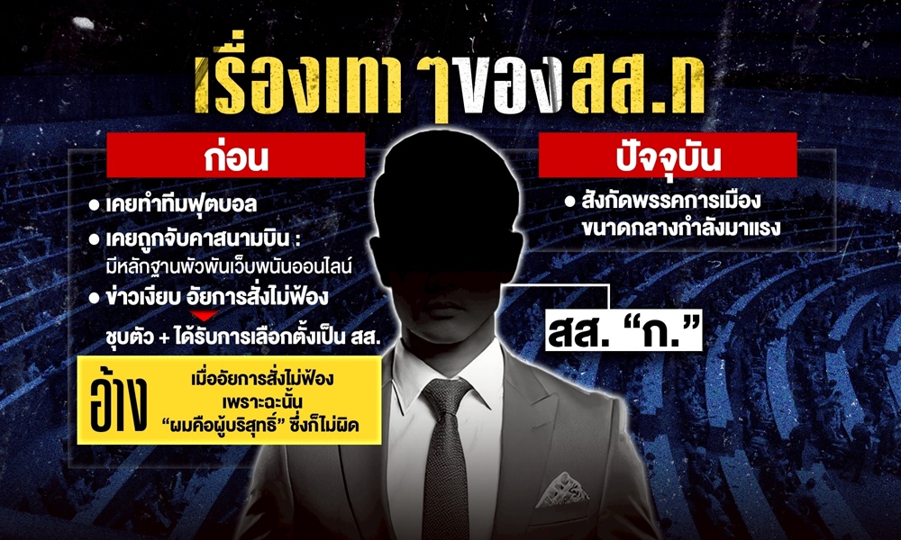 ก่อนจะเป็น สส. “นาย ก.” เคยถูกจับคาสนามบิน เพราะตำรวจมีหลักฐานพัวพันเว็บพนันออนไลน์ แต่เจ้าตัวให้การภาคเสธ อ้างเคยทำ แต่ถอยห่างออกมาแล้ว พอข่าวเงียบ อัยการสั่งไม่ฟ้อง ในที่สุดก็มาชุบตัวและได้รับการเลือกตั้งเป็น สส.ในที่สุด
