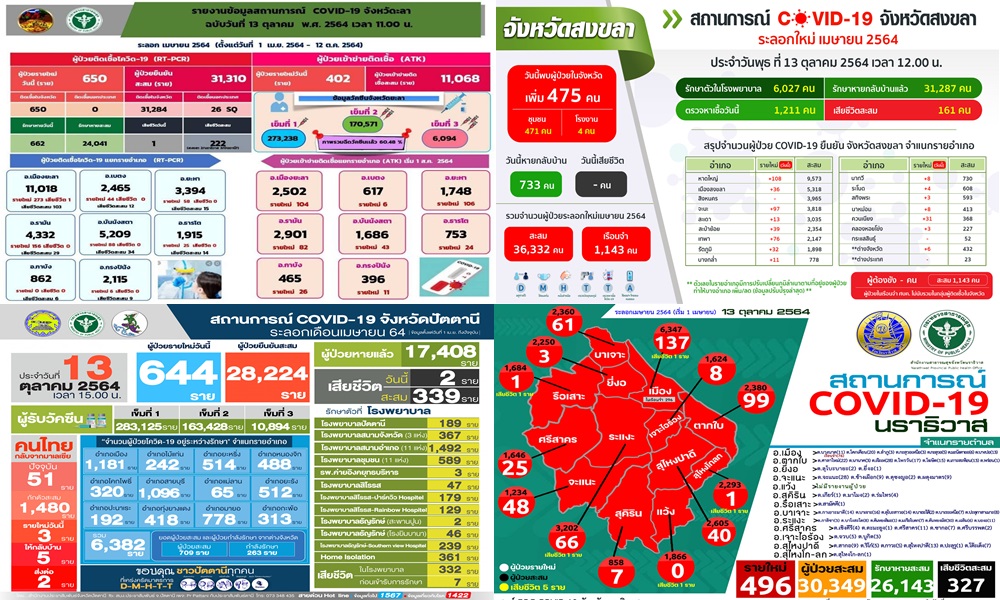 สถานการณ์การแพร่ระบาดของโรคติดเชื้อไวรัสโคโรนา 2019 (โควิด-19) ในพื้นที่สามจังหวัดชายแดนภาคใต้และจังหวัดสงขลา วันพุธที่ 13 ต.ค.64 จำนวนผู้ติดเชื้อรายใหม่ที่เพิ่มขึ้นอย่างต่อเนื่องส่งผลให้ทั้ง 4 จังหวัดชายแดนภาคใต้ ยังคงติดอยู่ใน 10 อันดับจังหวัดที่มีจำนวนผู้ติดเชื้อมากที่สุดในประเทศ