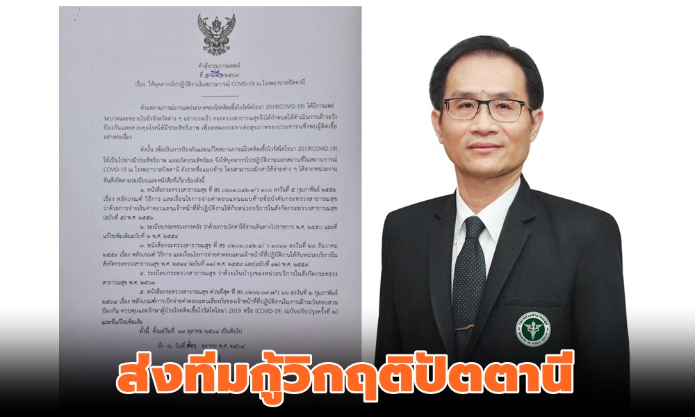 อธิบดีกรมการแพทย์ ลงนามคำสั่งให้บุคลากรไปปฏิบัติงานในสถานการณ์โควิด-19 ที่โรงพยาบาลปัตตานี พร้อมรายละเอียดเบิกค่าใช้จ่ายตามข้อบังคับกระทรวงสาธารณสุข ให้มีผลตั้งแต่วันที่ 13 ต.ค.ที่ผ่านมา